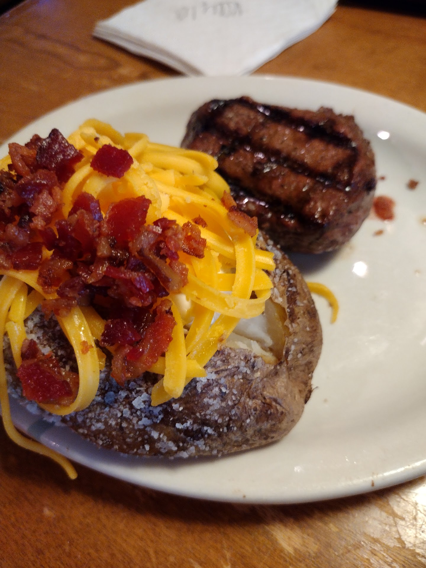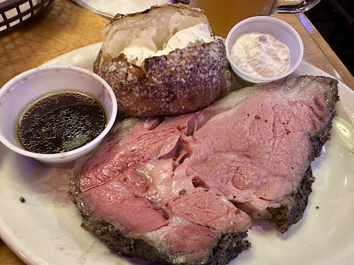 Prime rib - medium rare - that’s the ticket. I wouldn’t want to get much else really as charcoal homegrown family steak at home can’t be beat. However, my husband doesn’t really dabble in prime rib and this has been the best around. You really have to enjoy the fatty goodness. Au jus and horse radish sauce goes great with it. I also do enjoy their baked potato with the oil and salted skin. Caesar salad to add some greens was good along with the yummy buns that we had no reason to add to the meal but dang too tempting to not nibble on them while we wait. 🫣 We don’t get out to steak joints often since we eat that at home but that prime rib...