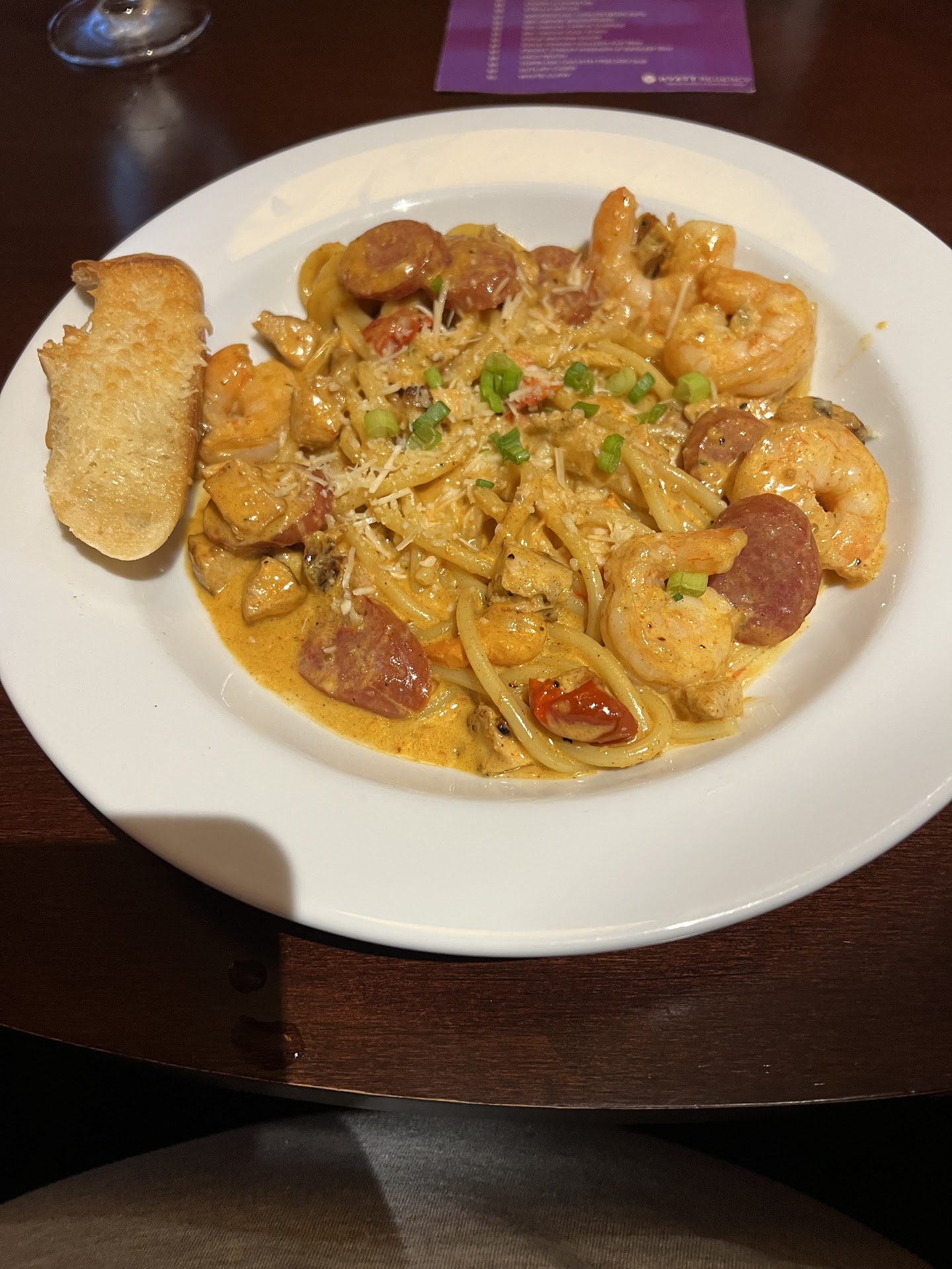 However, it was the Jambalaya Bucatini that truly stole the show. The bucatini noodles, often an underrated pasta choice, were the perfect vessel for the vibrant flavors of the spicy creole cream sauce. The Bell and Evans chicken breast was tender and perfectly cooked, the andouille sausage brought a necessary smoky kick, and the sautéed shrimp was a succulent addition that rounded out the dish. The crostini on the side? A crispy, golden touch to scoop up every last bit of that amazing sauce.