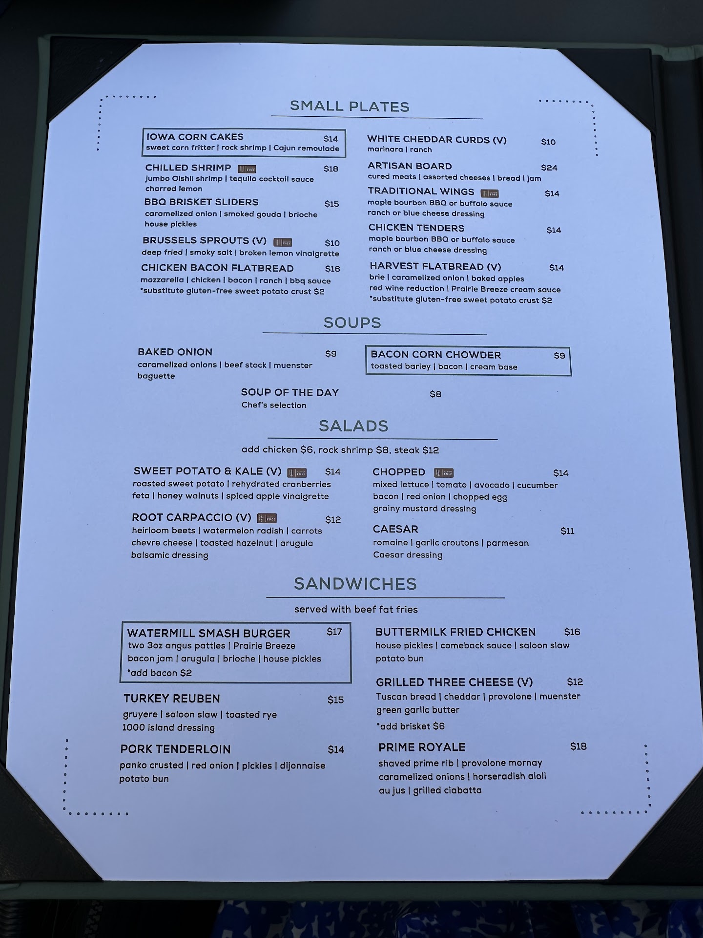 Read moreI would be very pleased if this were the restraunt at a hotel stay. We live local and we were intrigued by the pictures of food online and thankfully were not dissapointed. The food was very good. The Iowa Corn Cakes with Shrimp was our favorite as an appetizer for two. My wife ordered the Wedge Salad. I had the Watermill Smash Burger which was a tad on the greasy side(not necessarily bad but more than I prefer) but better than most burgers I have had locally. It was a tad on the sweet side but if you like bacon jam you should enjoy it. The fries were good as well. All in all I would recommend and we do plan on returning to try brunch and possibly a dinner date. Other dishes on the menu look amazing. The waitress highly recommended the...