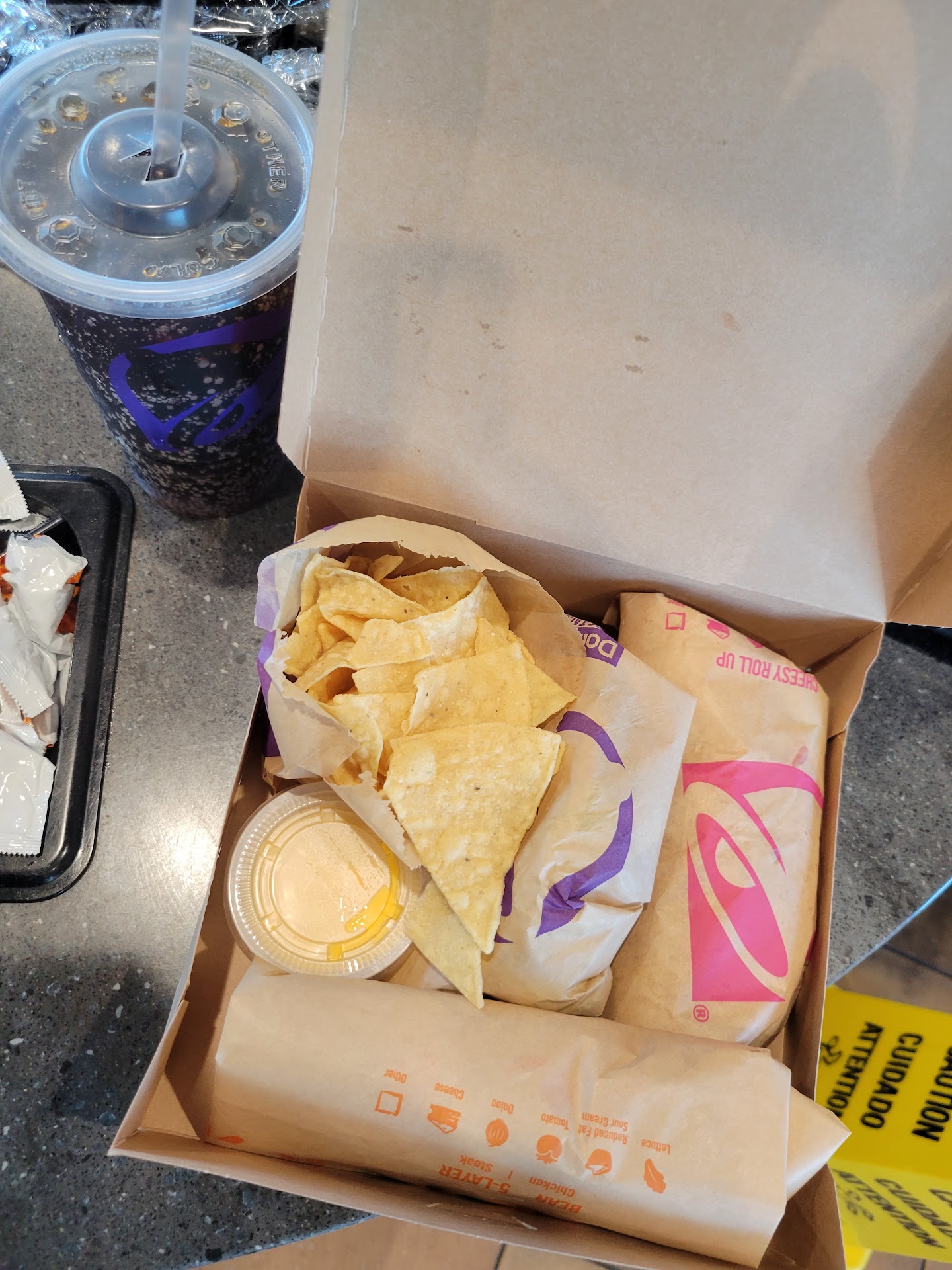 Read moreI came in at 9:00 pm, but I still expected good service. The cashier took my order properly (I had made a couple of adjustments). I watched the ladies on the line skimp on the ingredients. They put 4 tostadas, 2 chalupas, 2 burritos, and 1 taco in 1 bag. When I got home, I found 1 chalupaopen open and upside down on the bottom of the bag. I went back to the taco bell. They did remake the order, but it was with much complaining, grumbling, and blaming of everyone but themselves. No sorry. No let me fix that for you. Nothing. Won't go back...