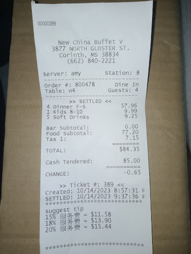 Read moreNew China Buffet was good as far as the food is concerned according to my husband. I only had tea. I told the waitress when she seated us that I did not want the buffet, I only wanted tea. When we got the check, they had charged us for 2 buffets. My husband pointed out to them that I didn't eat. I never got up from my seat until we were ready to leave. This young man whom we told preceded to get another waiter and they discussed the situation in Chinese and probably called us all sorts of names. Then he came to our table and picked up a fork and rubbed it as if to see if it had been used.That was very rude, The fork could have been dirty to begin with and I guess I would have been charged. They will never get another tip from me. Never said anything when he brought the corrected check. They can't understand anything but they know what check means. While my husband was getting his food, I opened his silverware and straw. When he returned he opened the other silverware unaware that the first was opened. They brought a new ticket with the corrections. So I understand people make mistakes but they were ugly about it as if I should want to pay $8.00 for nothing. I am always a tipper but I felt they were not deserving. Besides they never served us by asking if we needed refills. I think that we will not be eating there for a good while. I don't really care for it anyway but my husband does So you ask how was my trip to the New China Buffet? It was as far as I am concerned, the worse part of my beautiful day. I didn't have to lie about eating cause I could have still eaten someplace else. I prefer American or my own cooking to Chinese any day and from now on I will just sit in the car. So the trip there was truly...