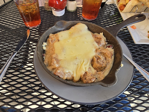 Great location and atmosphere. The open air vibe of Fenders Alley and music venue is great. The staff was very friendly and attentive as well. The food was typical bar and pub offerings so nothing stood out on the menu as a "must try" for us. We started with the Disco Fries. We rated them a 6. Flavor was ok but they could have been a bit crisper to start with since they were in a bed of melted cheese. We also ordered the bang bang tacos and again we rated them a 6... maybe a 7? Tortillas were crispy and toppings were good and fresh but frozen shrimp texture was a bit off when the batter comes off on the first bite. We also ordered the beef tips and red skin mashed potatoes. It was served in a skillet but looked like a mess. We rated it a 4 due to plate appearance, taste and texture. The seasoning was ok but the beef was tough to chew and the gravy wasn't very good. Then there was this huge piece of cheese on top that I wound up just pushing to the side. This one dish probably should not be on the menu in our opinion or we would recommend reimagining the dish and lose the cheese. Still would go back and try...