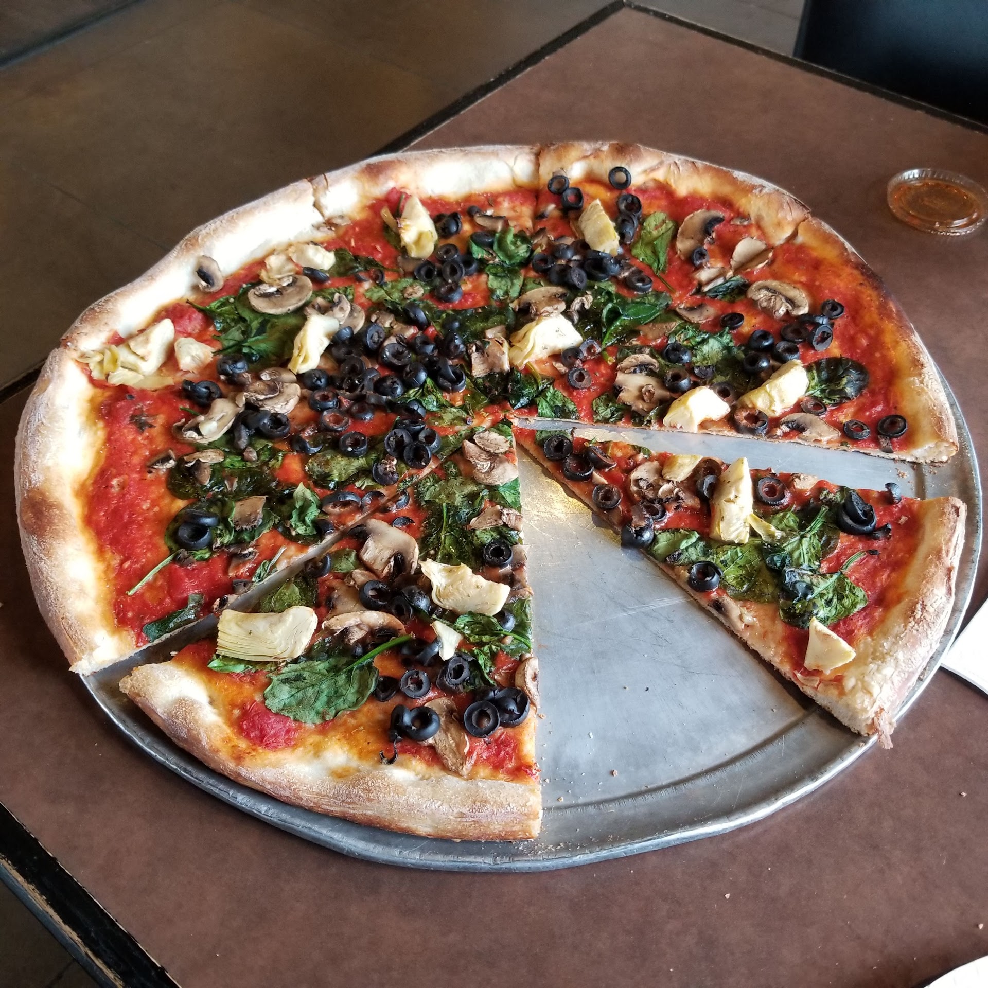 Read more1st time visitor yesterday. Very polite, friendly and clean atmosphere. Myself and daughter. She had a cheese and spinach calzone. I ordered the Brooklyn Botanical Garden Salad (which was fantastic), and a 16 inch pizza (plans to take home some to wife) . Both of us had water. Total bill $37.29. Requested receipt since $37 seemed higher than expected. Technically no receipt received, only a charge slip. It only showed total; not sure how total was calculated. I ordered no cheese, artichokes, tomatoes, mushrooms, black olives and spinach ( which I saw written down by the young lady at register). I'm guessing no credit for cheese removal, yet charged for all other items. As you can see from the picture, plenty of black olives & quite a bit of artichokes. (For some reason, unknown to me, no tomatoes.) However, the other ingredients and even the sause was sparing. Crust was fantastic, yet with scarce sause, a bit dry. Since my daughter has to go back to work within an hour, I said nothing at the restaurant. I honestly didn't see any exceptional reason to return to this restaurant in the future although we'll have lunch quite a few times together each month. Always looking for a pizzeria to patronize, (and don't mind driving 25-30 minutes to get there-we live in Charlotte); we've found several family owned in Concord that load them up for a better price. I will again say they were polite, friendly and very clean restaurant. For some reason the downloadable menu from website has pricing covered...