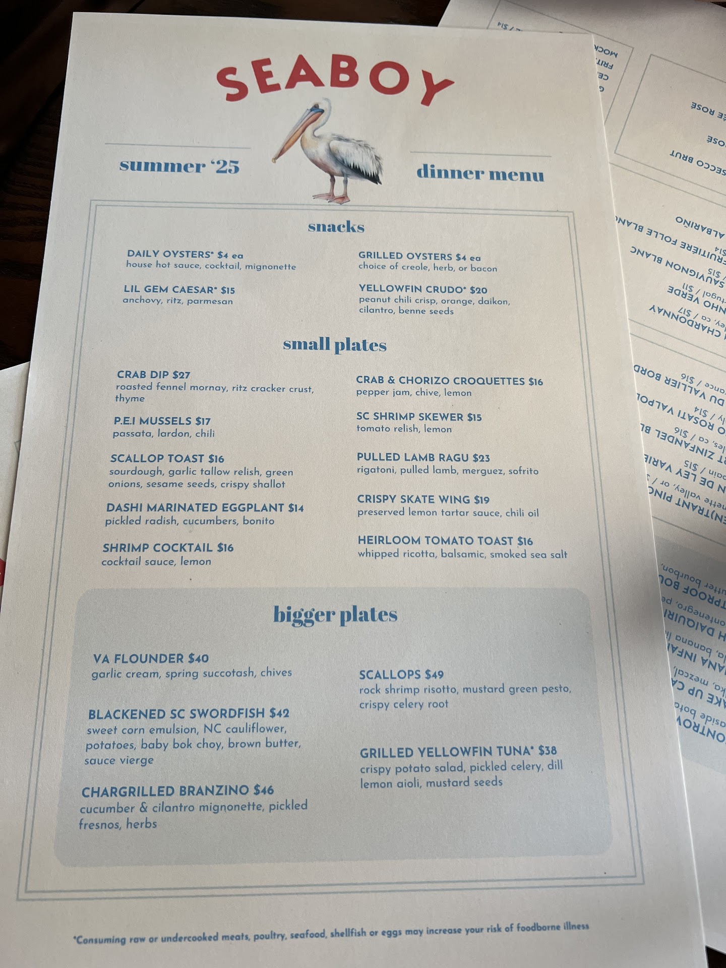 Read moreThis was my second dining experience at Seaboy. I must admit that I'm still totally charmed. It's a new spot tucked into an old house, which gives it that "cool dinner party at a friend's place" vibe. It's not overly polished, and that's what makes it kind of magic. It has a cozy, lived-in charm and someone in the kitchen who has a deep, committed relationship with homemade tartar sauce. Yum. The food? Excellent across the board. The Crispy Skate Wing is hands-down the star. It is light, crispy, and wildly craveable. The Grilled Yellowfin Tuna with crispy potato salad and pickled celery root? Flawless. The Yellowfin Crudo with peanut chili crisp and benne seeds brings bold, bright energy, and it's incredibly tasty. The Chargrilled Whole Branzino is a little dramatic (in a good way), and the Heirloom Tomato Toast, oysters (grilled or raw), croquettes, and swordfish all hold their own. It's hard to go wrong. We also had a Brut sparkling rosé called The Diver, and honestly, it was the perfect summer sip. It was dry, crisp, and begging to be enjoyed on a porch. Add that to the favorites list. It has a relaxed vibe and is slightly chaotic, with a casual approach to formality. There's no real waiting area, so if you show up early, you'll likely find yourself awkwardly hovering in the doorway, trying not to get hit by the door or a server. The staff is warm, eager, and full of personality, but occasionally so enthusiastic that the details slip. Our plates were replaced between courses, but a fork went missing. Minor thing, but notable. It's also hard to tell who's the maître d' and who's just confidently clearing a table. A few dishes came out slightly different on our second visit, but they were still good, just not quite what we remembered. Early-days quirks, possibly. Now, the logistics: parking isn't amazing overall, and walking from Davidson feels mildly hazardous, thanks to the lack of sidewalks. We did it anyway (we're walkers), but it felt a bit like an unintentional adventure. This place would definitely benefit from better pedestrian access for charm and safety alike. Still, I really love this spot. The food is thoughtful, the space is inviting, and the overall experience has that "perfectly imperfect" energy that makes a restaurant worth rooting for. It's not fancy, but it feels special. I'll be back often (probably for the skate wing, The Diver, and that wild little magic that makes it feel like a dinner party someone forgot...