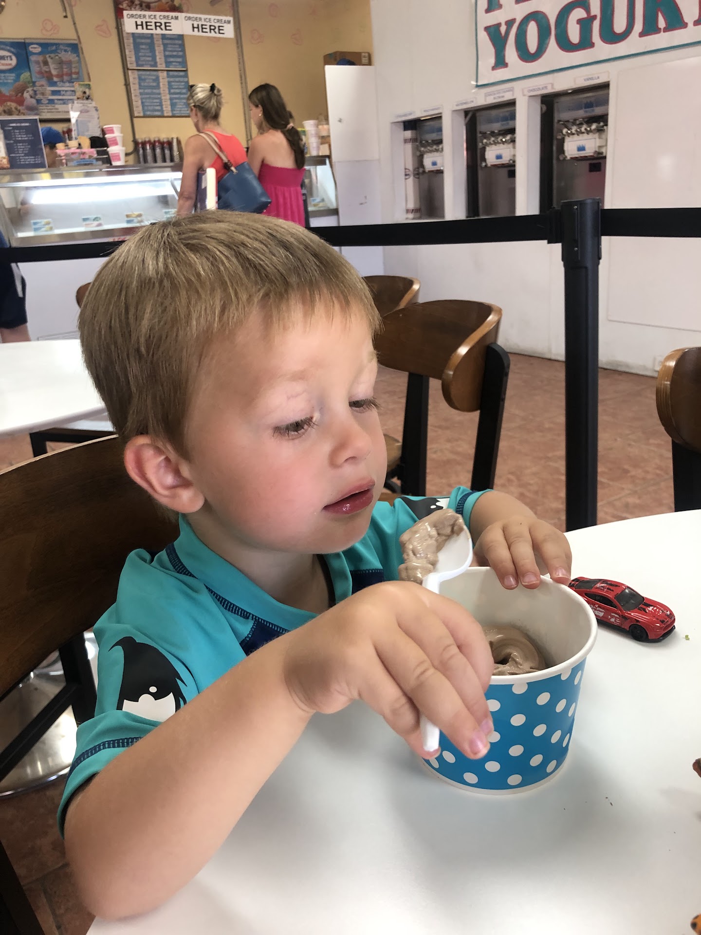 The service was frighteningly bad, made the entire experience difficult and overwhelming. While we were getting the total number of ice cream cups priced, one of the kids (9 years old and not paying attention) in our group wandered about three feet from the register. The cashier immediately started to scream that the 9 year old wasn’t allowed to go “there” and she had to stay “here” —not elaborating on either location— insinuating that a child was going to run off with the ice cream that was already rung up…while it was getting paid for and it was already rung up.