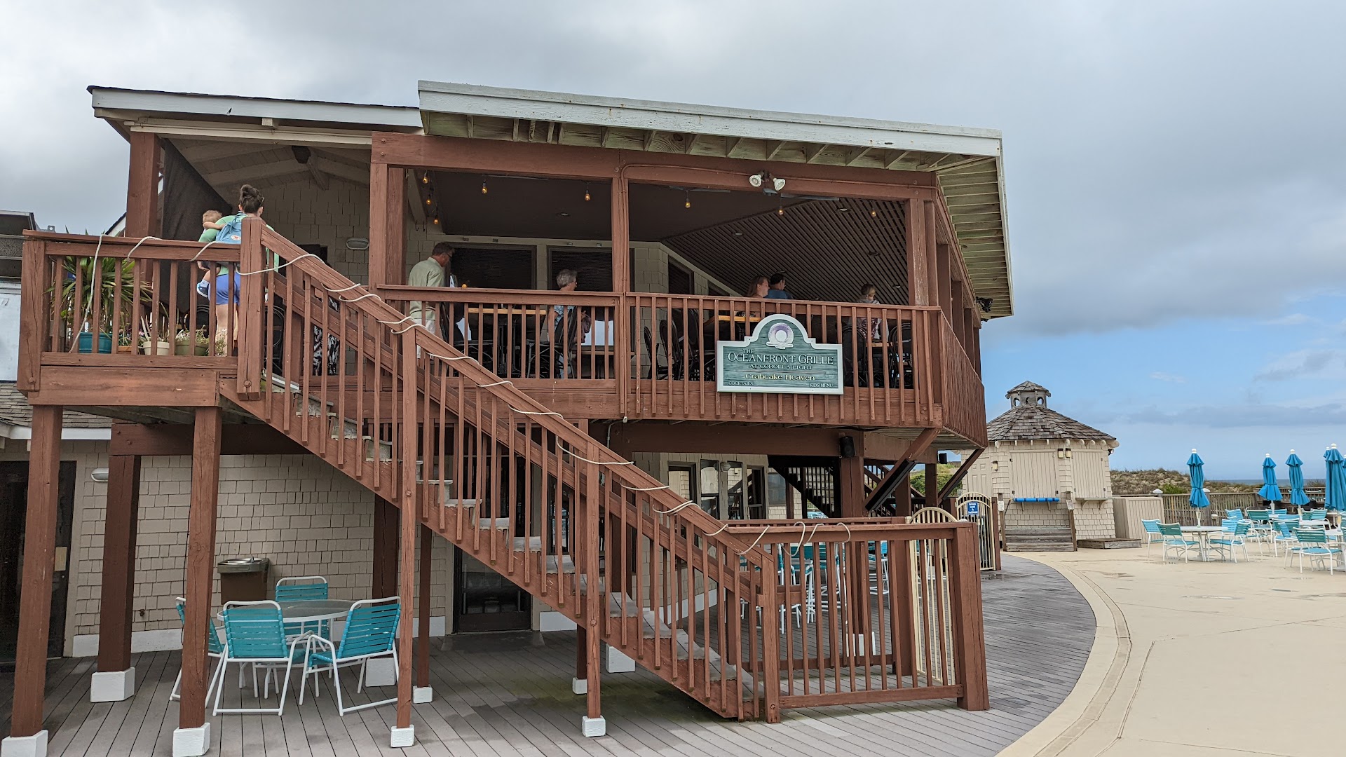 The atmosphere here is pretty nice. It is all outdoor seating on a covered deck which does have a view of the ocean which is a little ways out. As other reviews point out, It is also situated next to a clubhouse pool which is not the most ideal view when you're coming to a place with "Oceanfront" in it's name. Aside from that and as long as the weather is cooperative, the ambiance is very nice. While our visit was on the warmer side, there was a very nice breeze blowing constantly to offset the heat...the fans all around also help.