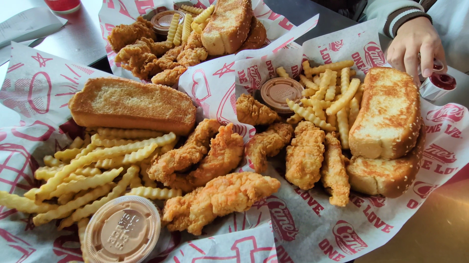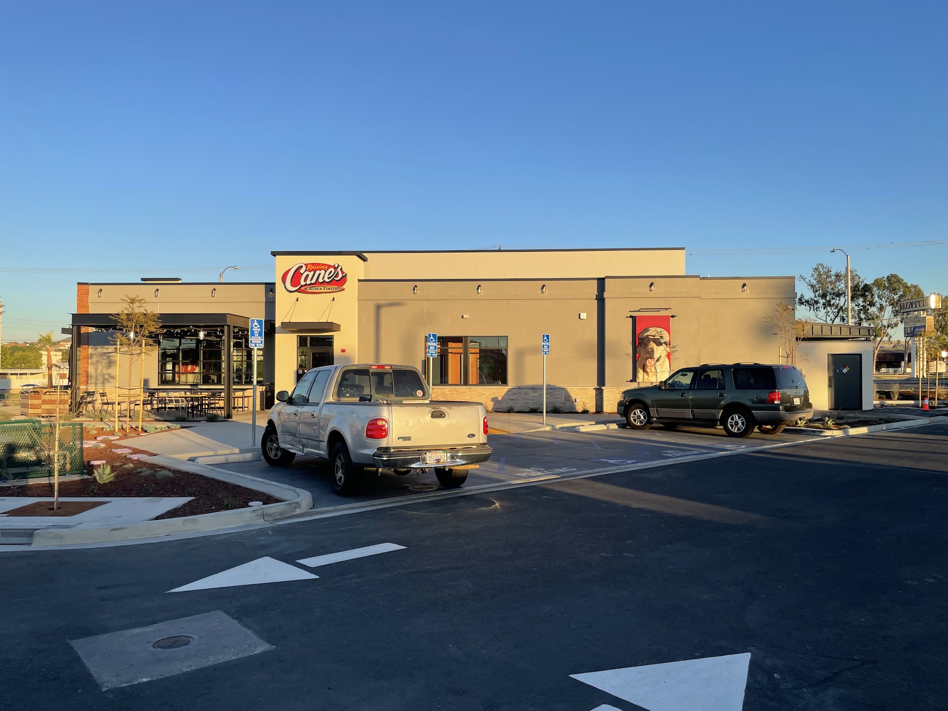 Read moreParking was super easy even on weekends. It is located right across from the habit burger. Staff here are always friendly, cheerful and polite. Love the decor inside, you will see the disco ball, portrait of Elvis, Lakers basketball, LA King and more. The restroom is clean. Service was fantastic! The staff will walk around checking in to see if we need anything. I am a fast eater, so I clear my food in a jiffy. The staff would stop by and ask to help clear the trays. You can feel the "One Love" vibe at Raising Cane's. Coming here puts myself in a positive state of mind. Our family loves Texas toast! They also sell some merch here like tshirts, baseball cap, etc. For people with pets there are outdoor patio dining options with the fans to cool you off on...