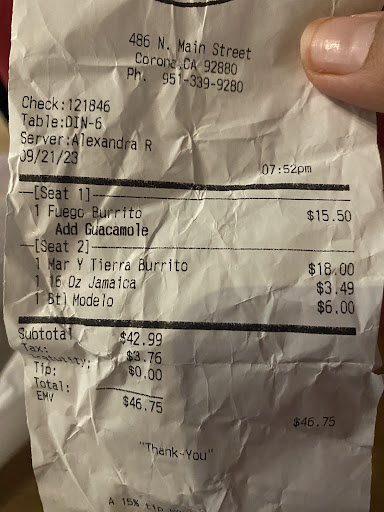 We ordered two burritos El fuego and Mar y Tierra , first of all we didn’t even get the mar y Tierra and el fuego burrito I told the server no onions and still came out with it. Once we realized our orders were messed I went up there personally and the server named Alejandra said they’ll fix them. Just for them to come back out and tell me “ THE KITCHEN DOES NOT WANT TO REMAKE THEM” I was like wow who says that to paying customers. I told her I was allergic to onions and they still did not want to remake the order I was upset , so she said I could speak to the manager she was suppose to go get him. But this MANAGER WAS A BAR MANAGER and not once did he bother coming out to speak to me about the messed up order instead this man gave me DIRTY LOOKS LOOKED THE WHOLE TIME I WAS INSIDE WAITING FOR THEM TO FIX THE ORDER. they finally agreed to fix the burritos. Alejandra even mentioned to me that the kitchen had messed up the orders when I called to let them know I was on my way back up there. That’s not my problem the kitchen messed up my orders as a restaurant it’s important to double check customers orders before sending them back out. When we got our burritos they were put together as if they said “FK THEM AND THEIR FOOD JUST SLOPPY FOOD” manager wise no people skills. servers have attitudes and food is not good whatsoever. NEVER COMING BACK TO THIS PLACE WASTE OF MONEY AND TIME. Wish I could give this...