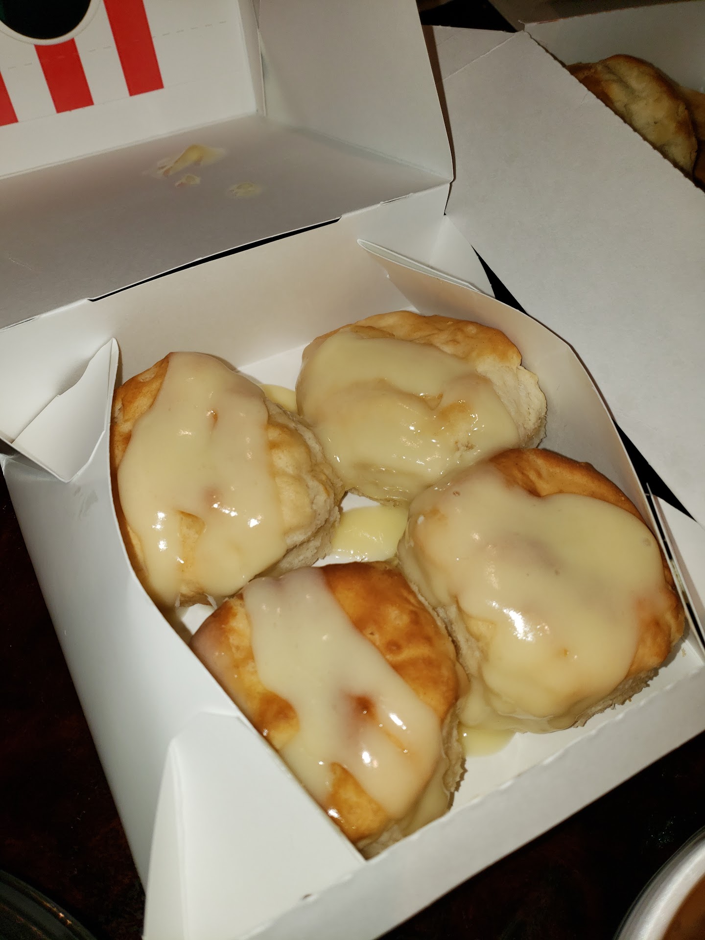 But the food was worth waiting for - big bucket of crispy chicken with 2x Cole Slaw and 2x Mash Potatoes & Gravy, 8 Biscuits and the Lemon cake. Everyone was very pleased with the food and the food was still hot when we got it home.