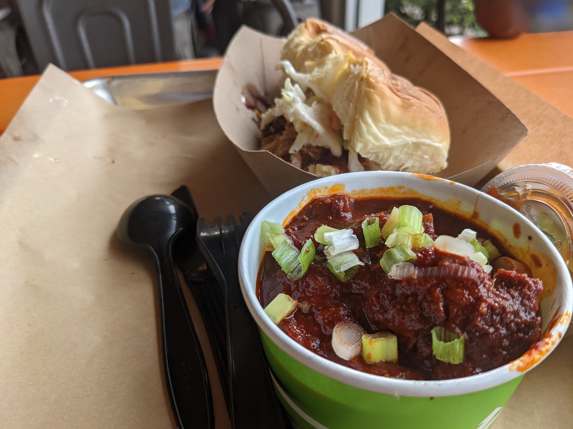 And the brisket chili. There are so many recipes that can be adopted there is no reason for the chili to taste like brisket stirred in tomato paste. Heck, my chili would bring them droves of crowds and I'm willing Lil' Piggy if you want to dance. Ummm, chili powder is actually supposed to be in chili. I took two spoonfuls and the rest was unfortunately wasted.