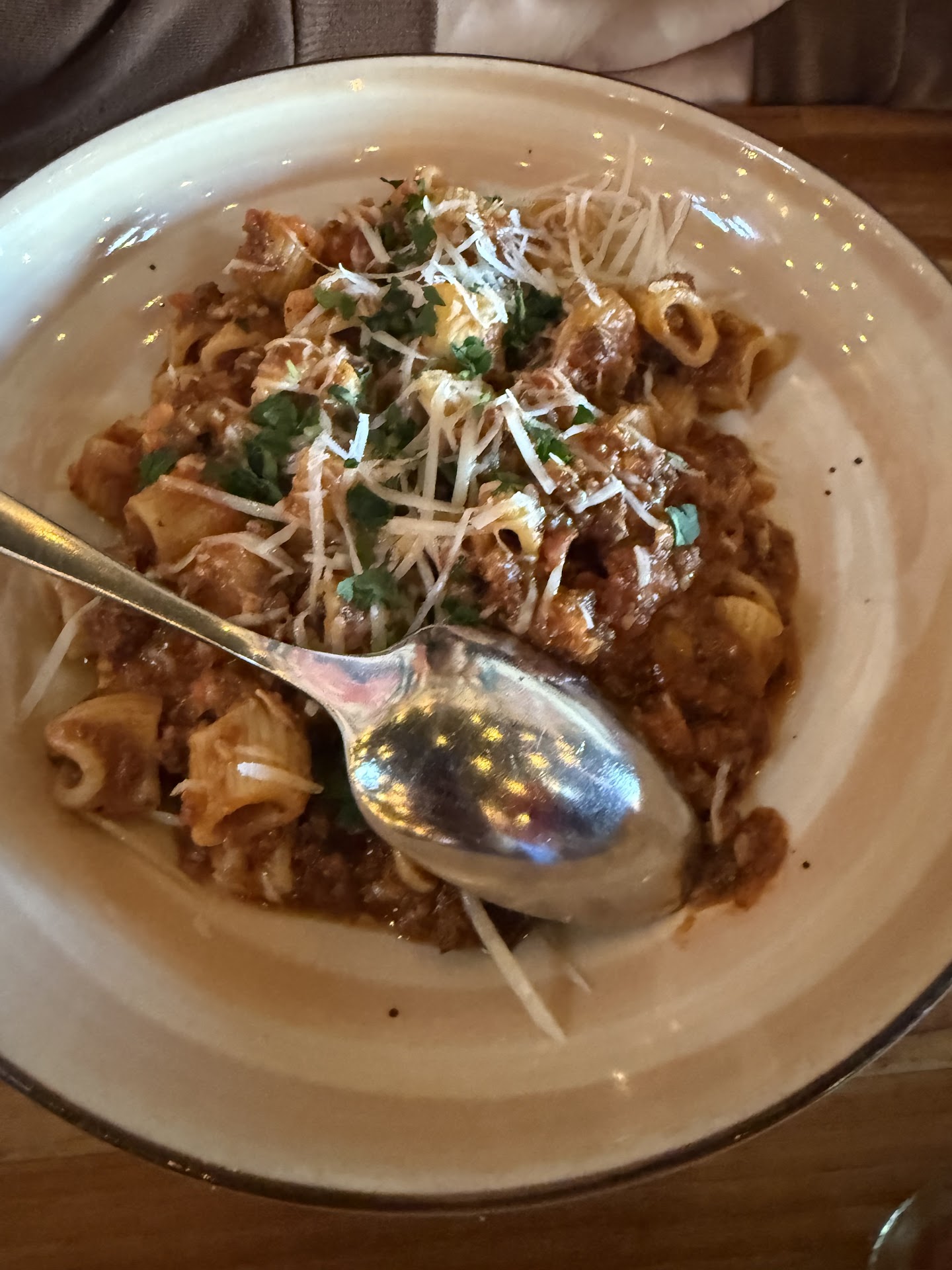My entree was over the top - huge serving and they were overly generous with the creamy pesto, which was delicious! Pasta was done well. Not a fan of the meatballs - thinking they had too much rice and too much oregano in them as they just sort of fell apart on my plate.