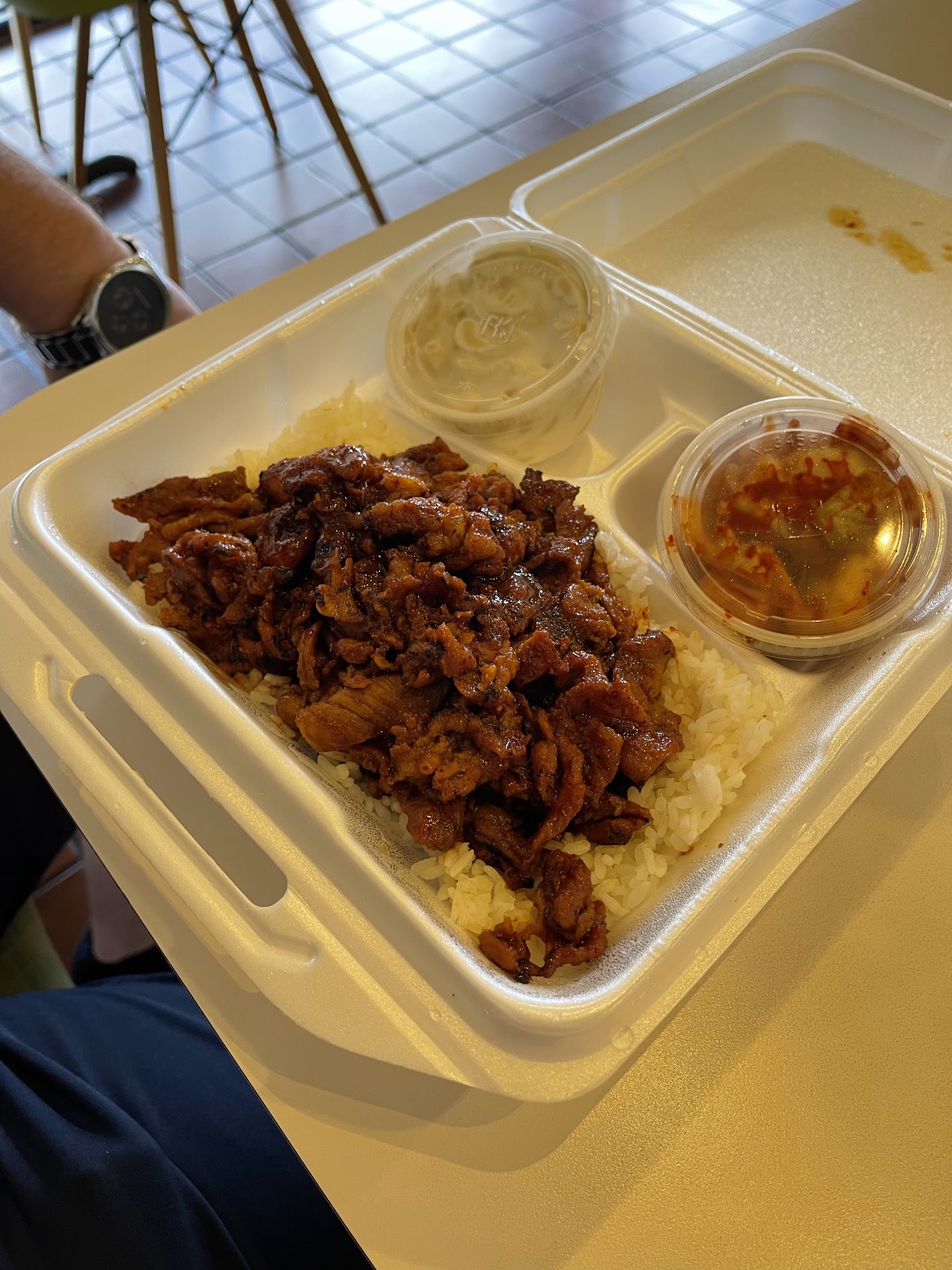 I highly recommend the spicy pork bulgogi. Buckle up the spice hits you right in the mouth. My eyes water my nose runs and I finish my bowl every single time. There’s a few simple sides that elevate the dish I recommended the kimchi, macaroni salad (cuts some heat in just the right way) and a cabbage salad to mix in with the pork.