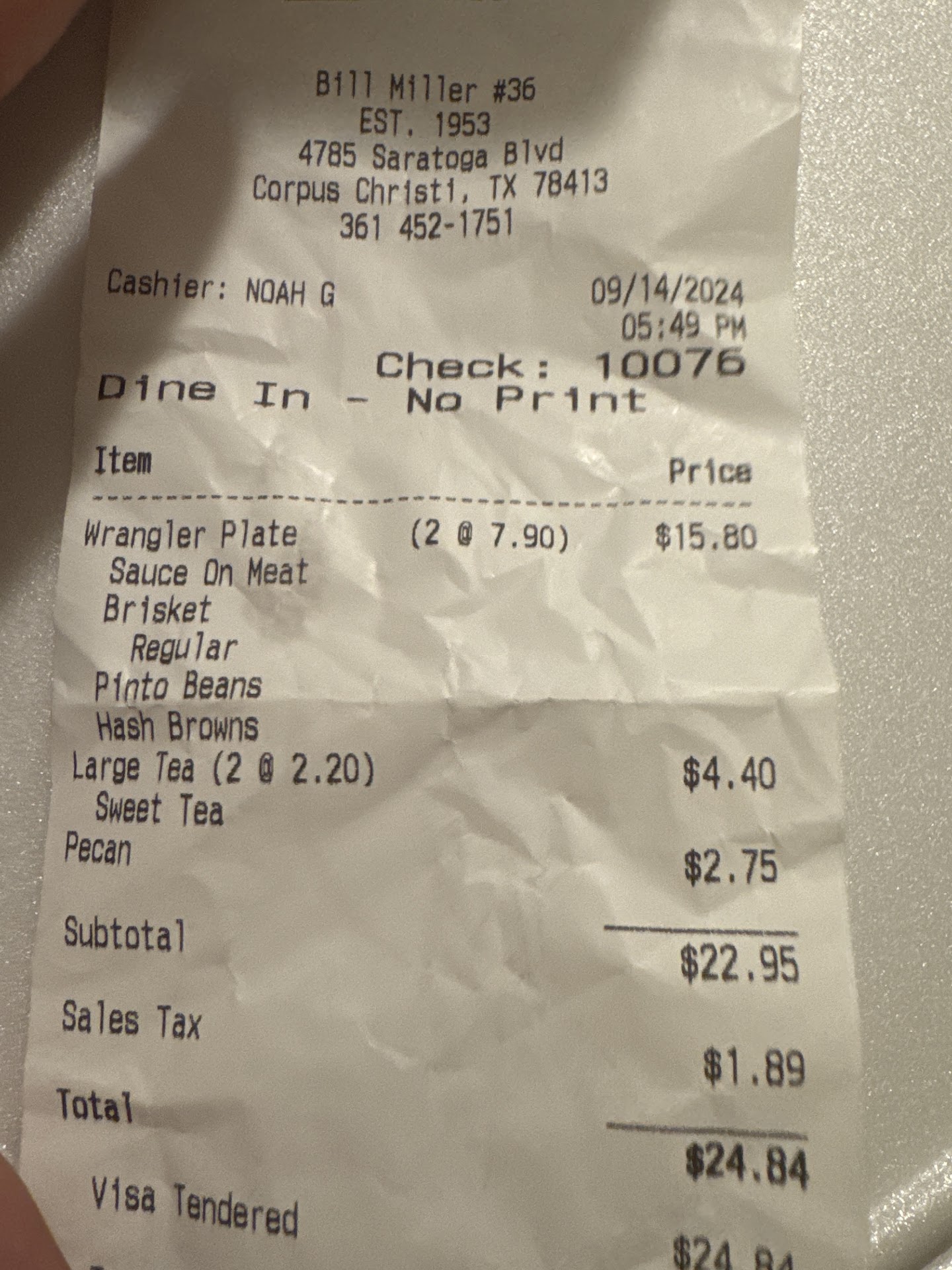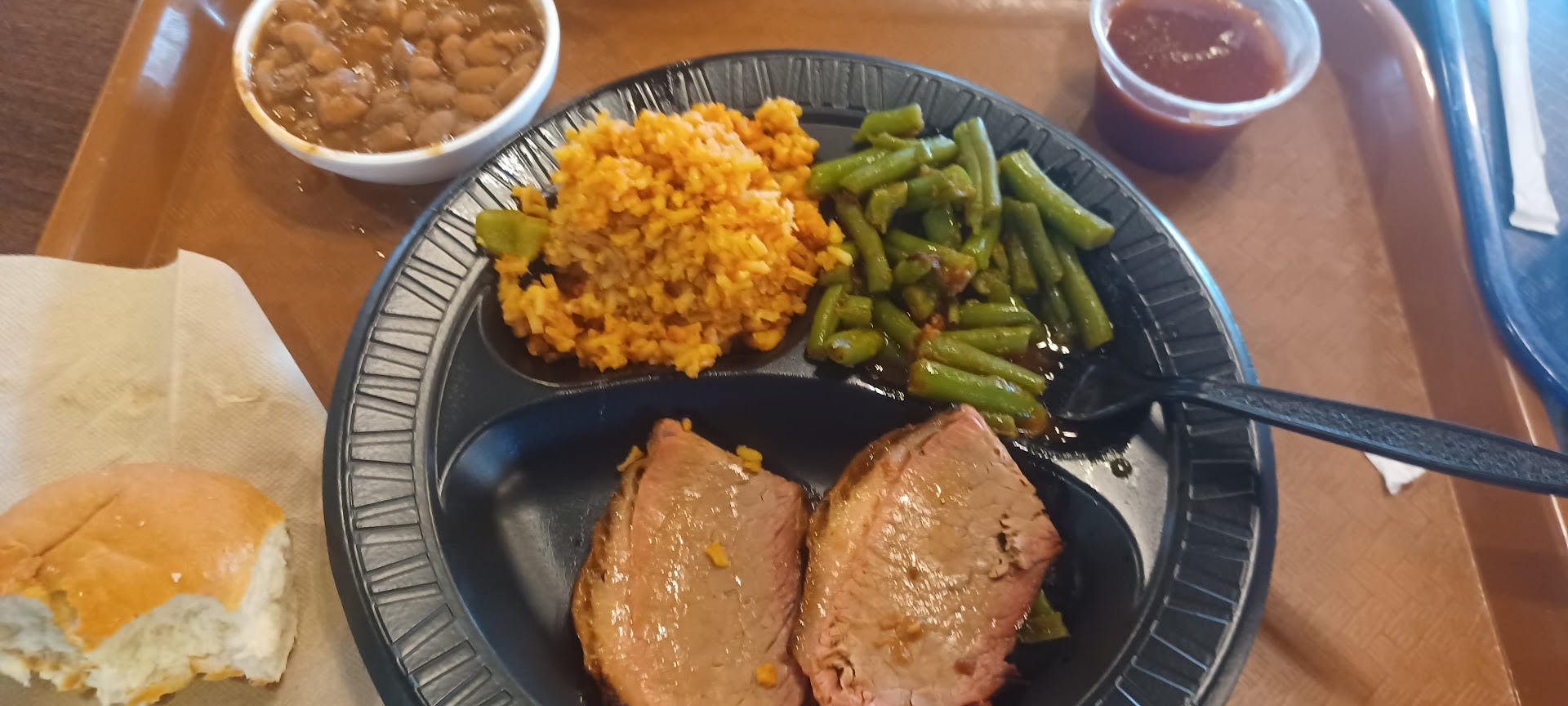 The Wrangler Plate with brisket was perfectly cooked, with the sauce complementing the smoky flavor of the meat. The sides of pinto beans and hash browns were hearty and flavorful, just like youâd expect from great Texas BBQ. And of course, the sweet tea hit the spot, refreshing and not overly sweet, the perfect pairing with the meal.