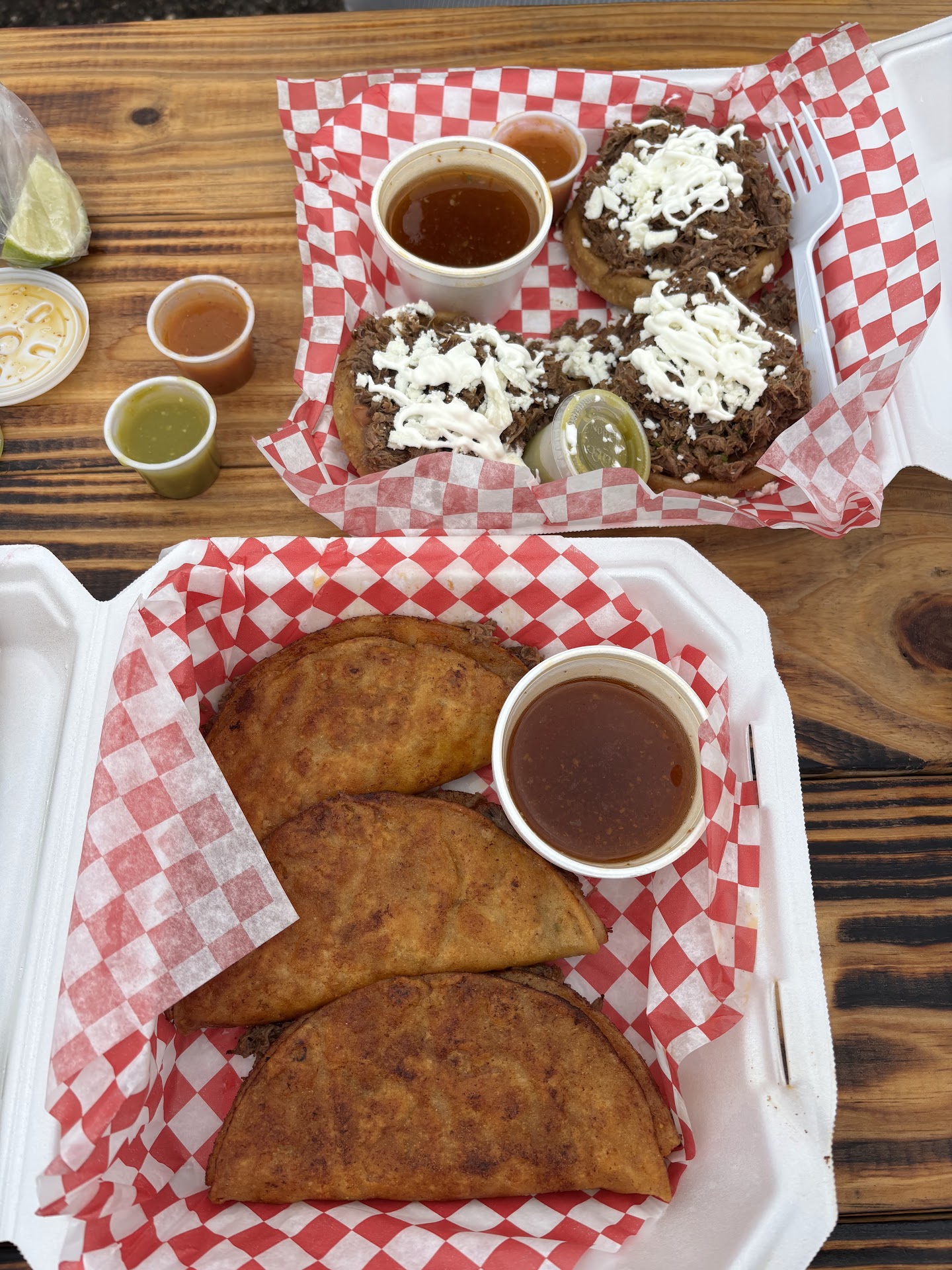 Super friendly & personable service to make you feel like a valued customer. Excellent attention to detail during food preparation. The quesitacos are loaded with birria & cheese, though the flavor & texture gets monotonous after a few bites, even after adding the accoutrements. The sopes on the other hand have very complex flavor & texture with the hot & beefy birria, soft corn cake, tangy pickled onions, cool sour cream, & herbaceous cilantro & oregano. The consommé has great intensity. Both green & red salsas add heat & flavor. No seating so either sweat it out, eat in the car, come after sunset, or take it home. Make sure you have napkins. It will be some of the best birria you've had, but not standout enough that you dream about it. They deserve a lot...