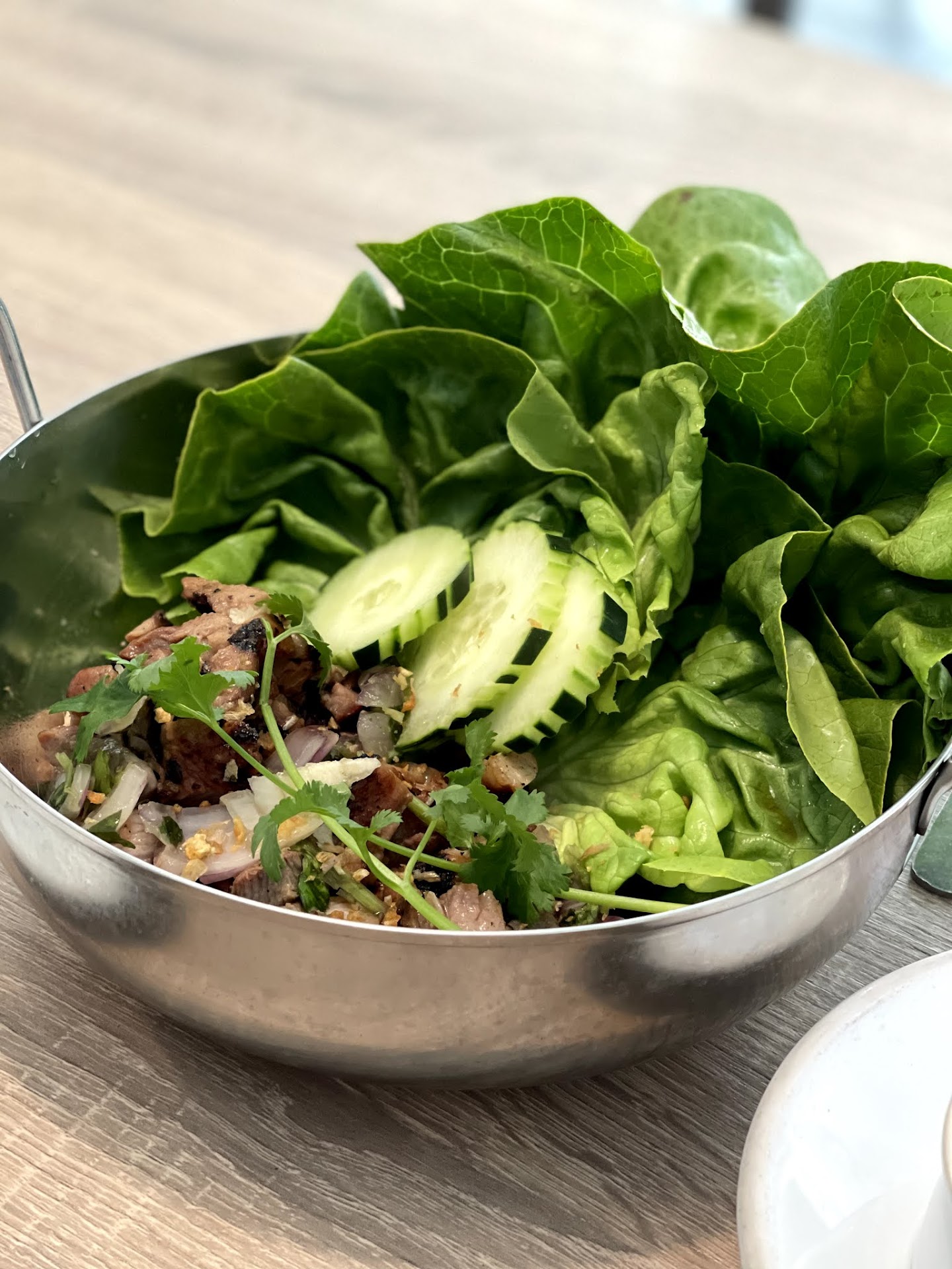 We got the Moo Yang Nam Tok (Lettuce Wrap) it was served with butter lettuce I believe. The pork was delicious, tender, and wonderfully marinated. It was sweet, salty, and a little spice to it. Hitting all the umami flavors. We also ordered the Thai Summer Rolls, just your typical spring roll. It wasn’t amazing, but it’s a must everywhere we go and it’s on the menu. My husband’s only complaint was how it was cut, the filling would fall out the second he would bite into it. It was served with the standard peanut sauce. The sauce was a good consistency, it wasn’t too thick or too runny.