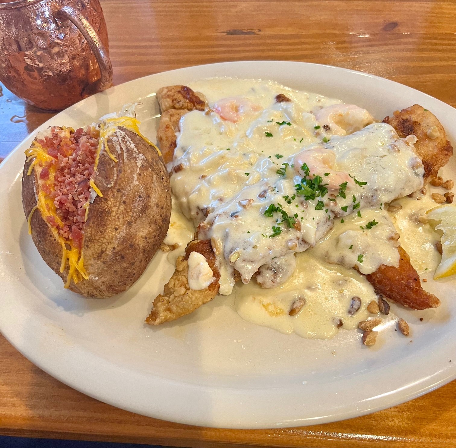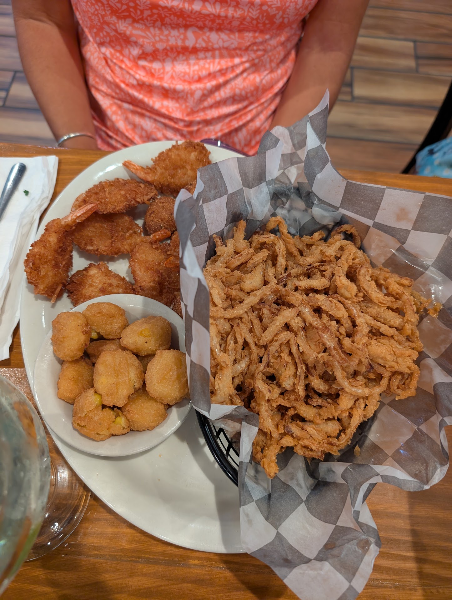 Read moreI hurt myself here. Everything and I mean everything was delicious. I had steak and grilled shrimp,Mashed potatoes, fried calamari, gumbo (lots of shrimp in it), Caesar salad and carrot cake. My husband had the seafood platter with a baked potatoe which is a deliciousselection of fried goodness. Portion sizes were large enough to satisfy the appetite of anyone coming from the beach. Come hungry. Service was immaculate, glasses kept full, menue knowledge, even timed the food to come out as we finished the appatizer and then later the dessert. Restaurant was clean and seating is comfortable but not crowded. I will be returning tomorrow for breakfast before I wander home. So good.