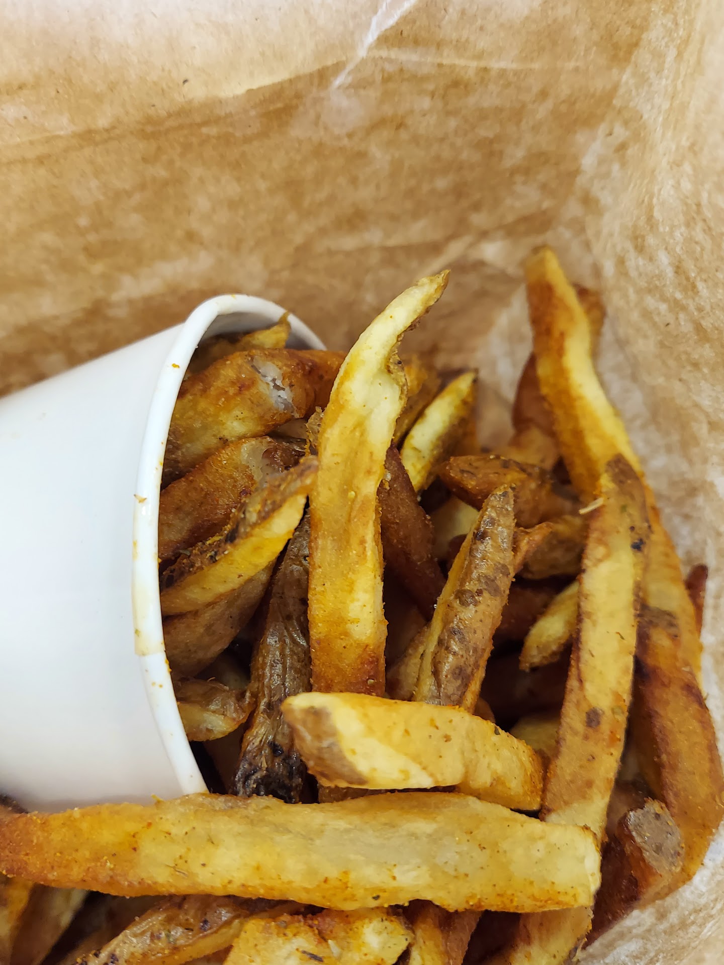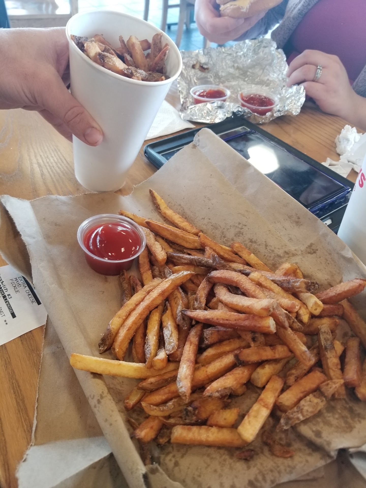 Read moreI love Five Guys burgers and fries with one exception; I don't like their buns. They seem like just super cheap buns. Not sure how else to describe them. They don't hold up to the burgers and everything they put in them. I think this may be what they're going for but I'm not a fan of soggy crappy buns. Buns aside, the burgers are awesome especially with everything you can get on them. They don't skimp on the toppings nor do they skimp on the fries. Whatever size you order of fries they fill the cup then put just about the same amount outside the cup in your bag. Love, love, love the fries! The shakes are really good as well. Everything is fresh. No frozen fries as someone else said they looked frozen.