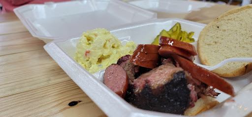 Do not sleep on this strip mall place that looks like it may not even be occupied when you arrive. You can smell the mesquite burning the minute you exit your car-didn’t get a look at the pits. Upon arrival we were the only customers, creating questions. Really quiet. Only a young couple behind the counter. Minimal menu written on butcher paper tacked to the wall. Three meats available-sausage, brisket, and pork ribs. Simple sides like slaw and potato salad appearing to be commercially made, not in house. Neither of those are very good. One sauce on the tables with a sweet leaning flavor. I didn’t ask about it’s production. We ordered the three meat plate so as to try some of each. Sausage really good with a light burn of black pepper. We liked this very much. This was sliced behind the counter which I think is a mistake as it dries out as it sits on the tray during dining. Pork ribs came as two and a half bones and had an excellent pull. Not dry or over cooked at all. Brisket was a a very large pair of slices which was quite fatty imo. Was not asked what type we preferred-lean or fatty-but it had a lovely smoke ring, a deep rub redolent of black pepper, and a full mesquite flavor. The slices were best toward the top near the bark, as the lower portion nearest the fat was a bit too mushy for my taste. It was good with a drizzle of sauce and wrapped in the included white bread though. This very generous meal along with two beverages and tip came out to less than $30 making it a killer value when compared to...