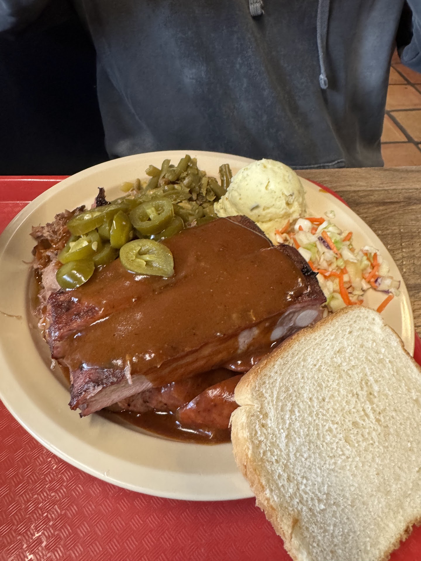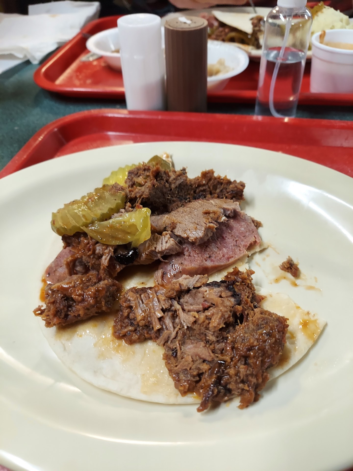 Read more3.5 stars here. 4 stars for the meats, 2 for the sides. Somewhat hidden joint in an industrial area off the beaten path but the large number of pickups in the lot told me that it wasn’t a place that is unknown. Unable to see pits here but learned they burn mesquite rather than the more common post oak. Surprising lack of smoke aroma on arrival. Counter service spot where the meats are kept warm in a series of pans and you choose from an extensive menu of choices-brisket, ribs, quarter chicken, ham, sausage, turkey breast. Available as plates, sandwiches, and unique “tacos”. And some quite large baked potatoes went by as we made our decisions. Everything is ready by the time you reach the end of the counter and pay. Sauce provided from behind the counter was quite sweet. All sides-both cold and hot-are self-serve from a long salad bar set up in the dining area. Our meal choice was a 3-meat platter, with Pork loin, sausage, and turkey. Here was our feelings on our meal this visit.