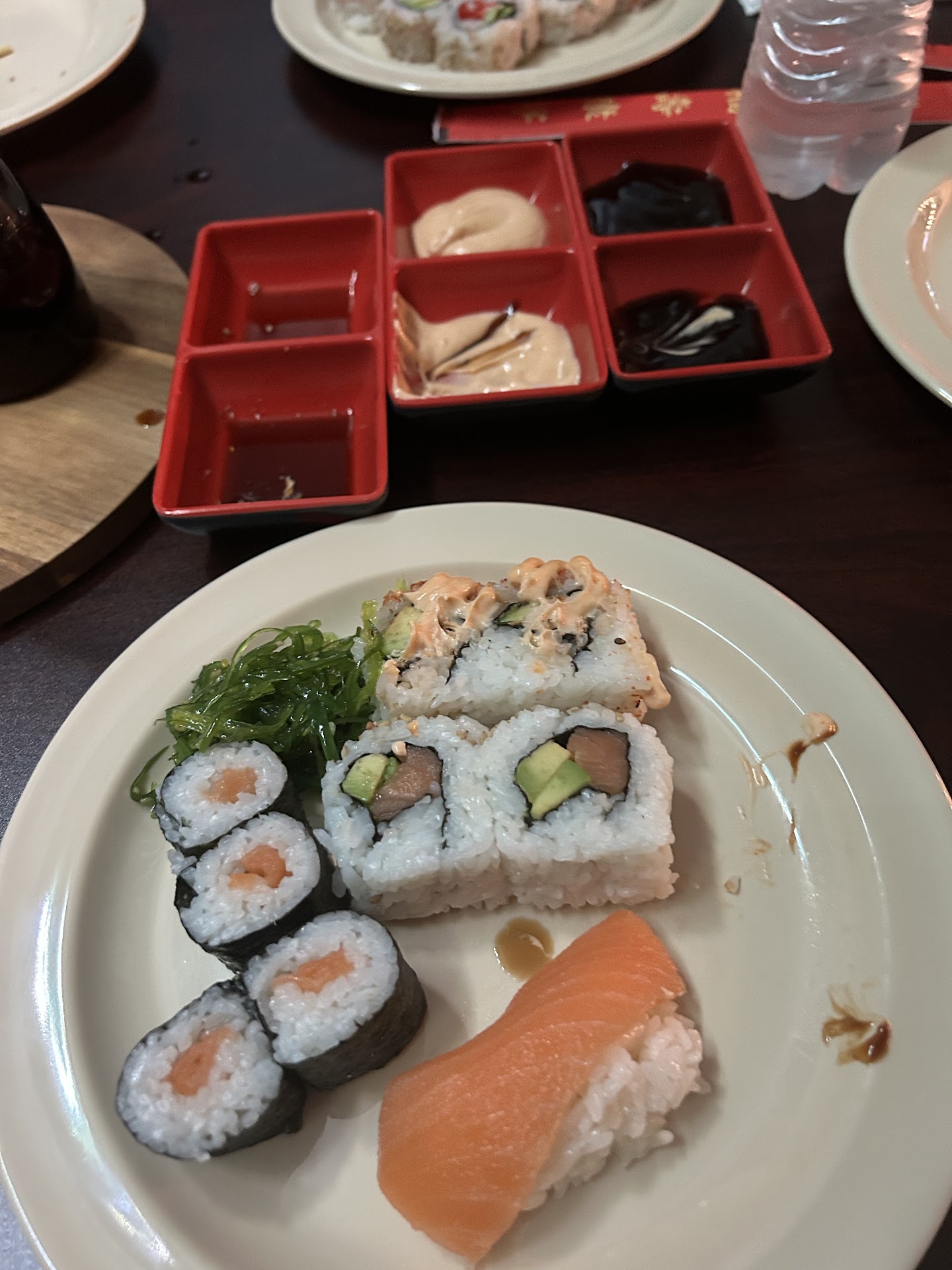 I'm giving this 4 stars because this is a small business and ultimately they gave what they offered: all you can eat sushi buffet. My review is that the sushis often had more rice to filling, and filling was less fish than everything else. Most rolls have a lot of sauce toppings, there were a few rolls also had what I think were spicy cheetoh dust, and most rolls were also filled with imitation crab making for a somewhat limited variety if crab is not your interest. Sashimi is sliced thinly with 6 sashimis on coming out on a tray at a time. Self serve for everything. For some people this is all bonuses, it all comes down to personal preference, but this wasnt exactly what I was expecting when I read the other reviews. Fresh watermelon, canteloupe and grapes. The lighting is very, very dim, and it is cold so don't forget a jacket. 18.99 for one person is reasonable, I just...