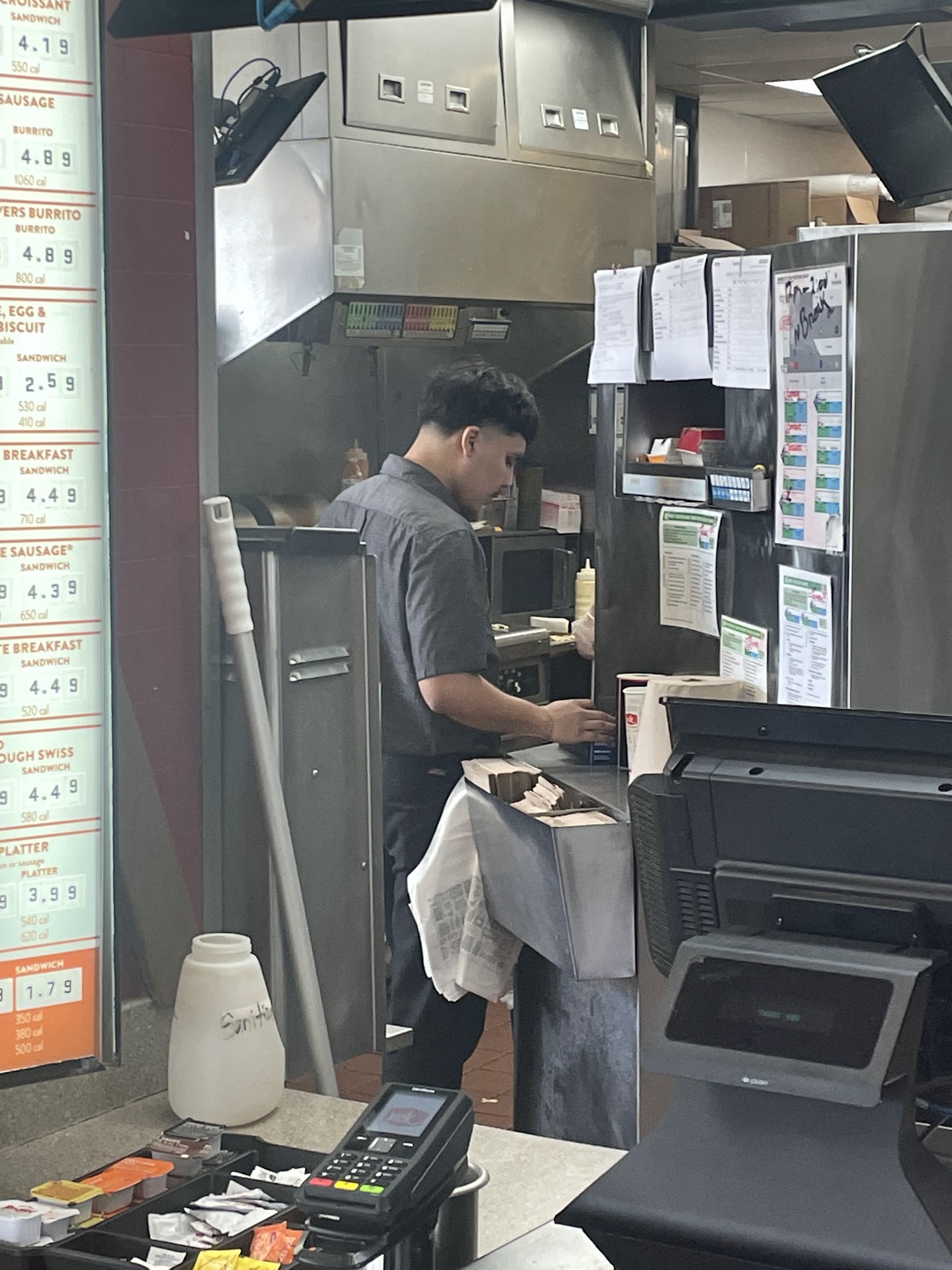Read morePretty disappointed with my experience. The food seemed normal and fresh for 11:30pm, the staff was nice, if not playing a disappearing act here and there, but the store itself was a wreck. The lobby looked liked it hadn't been touched in at least an hour or longer, as nearly every table had food/wrappers on it, or hadn't been wiped. The soda machine had overflowed and sticky liquid covered that whole corner of the area. Even with the signs I was extremely uncomfortable trying to get a drink or napkins and stuff, I felt like I was going to slip and it left my shoes sticky. Going to the bathroom, it had most definitely not been checked "every hour". Toilet paper was strown about, and it pretty trashed in general. Luckily I was just in there to wash my hands.... I know we were in there the last thirty minutes of the dining room being open but, you're still open, and it's just not acceptable in my opinion to just leave everything untouched until you're closing... No one wants to see that, last few customers of the...