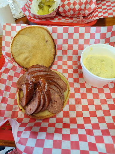 Read moreWe had not been here recently, but in the area on a tight schedule. My husband had a brisket sandwich with pinto beans. The brisket was good , good bark , not to dry . The beans were ok just no spice. I had a sausage sandwich with potato salad. The sausage was pretty good , it did have a good smoke flavor , the potato salad was ok , I am Texas born and raised and I do make my potato salad with mustard in it ,but this one was to mustard forward , maybe a little bit of mayonnaise to temper. We also had a piece of pecan pie , it was sooo gooey and good , in fact , took a piece home!! I will say I am not a big sauce fan , as I feel good meat should stand alone , but we did try it and it was 100 % improved. Last time it was runny , no spice and waaaaay too much vinegar. Not this time , It was thicker, had a just right kick and not a strong...