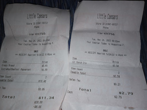 Read moreI will never come back to this location. I went through the drive thru and ordered 1 emb pizza 2 crazy breads and 1 sauce. They told me total was 11 something. Cashier comes back and I see only 1 bread so we ask did you get 2? The cashier lies and says yes. We pay and she hands us 1 emb pizza 1 crazy bread and 2 ranch. I asked what about the other bread. She then says I only have 1 and I only charged you for 1..I paid with a 20 but she only handed me a 5.. I thought it was universally understood when you go to Little Caesars and order crazy bread and they ask if you want sauce they mean the marinara sauce. Not 2 ranch. What they did was rung up the pizza and the bread then on a separate ticket 2 ranch. Which is why I thought that a 5 back from 20 when I was told my order was 11 something was ridiculous. To recap. She lied, messed up the order and charged me for something I didn't ask for. This was 9:40pm. 1exm pizza, 2 crazy bread and 1 sauce for 11 something does not equal 1 pizza 1 crazy bread and 2 ranch for about 14.. Never coming back .. Cashier was skinny girl...