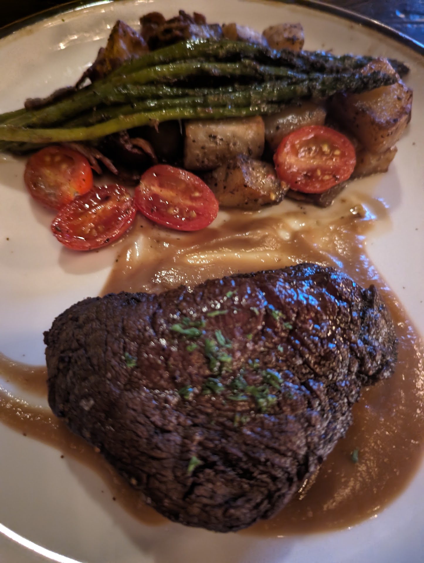 My wife and I wanted to try this restaurant out for some time. Unfortunately, I think they had an off night as I've heard others talk very positively about the food and service. We decided to eat here for our 24th anniversary, which made things extra disappointing. The waitress was bubbly and enthusiastic in her interactions. For some reason she was pulled away midway through our meal. I had planned to order a bourbon but lost my will to order after I didn't see her for a while. Apparently, the bar tender was assigned to our table and came over when she saw me looking around. But the worst part of this experience was my steak dinner. I ordered this $42 steak as medium. What I received was a somewhat small and thin, crispy burnt (see pic) steak on the outside and medium to well done on the inside. The first few bites were well done and down right dry and hard to chew. The middle parts of the steak were better, but overall I was underwhelmed and disappointed. I swear this steak was probably reheated in some way, maybe a left over piece from Mothers Day service. Even the vegetables had a charred, recooked quality. My wife had the two small burger appetizer which was "good" by her description but not great. The appetizer consisted of three small pieces of bread, which were tasty but not filling in any way. The highlight of the meal was the french fries which were piping hot and crispy with excellent flavor and a very large portion - maybe some of the best fries we've ever had... The problem is that when you spend $175 (including tip), the fries should not be the highlight of the meal. Given the cost of this restaurant and sketchy quality/quantity of food for this meal, I'm not sure if I want to give it...
