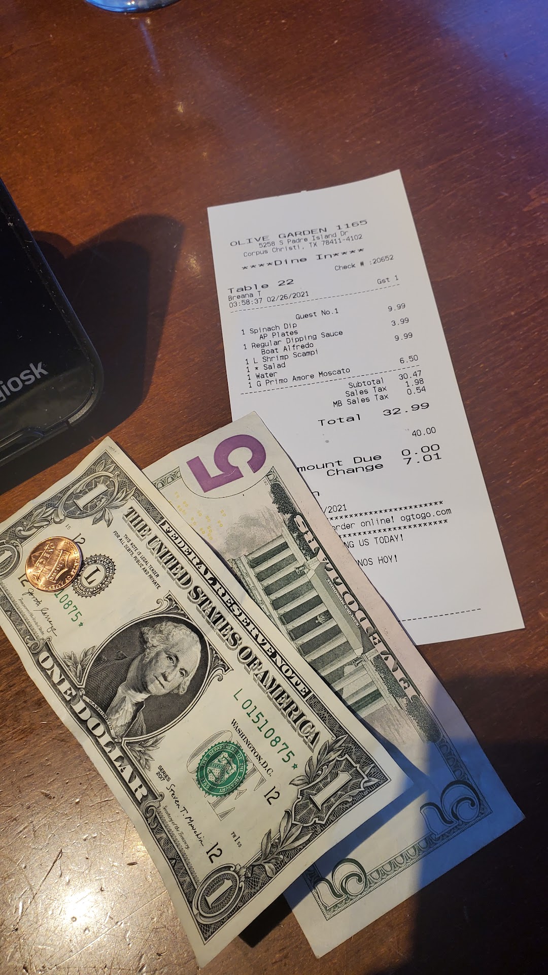 Read moreWent for lunch to celebrate my birthday on 2/26 only to receive what has been the worst service I have ever experienced in my life. Our server Breana T seemed to be a bit distracted since we got there. Understandable. Busy day, needy tables, overwhelmed kitchen running slower due to the lunch rush. Totally understandable. As our visit progressed, her attitude and service got worse. I was uncomfortable while I was boxing up my food while she just stood there over my shoulder pressuring me to finish up and hand over my dishes. When it was time to pay, I asked her for my check since I was paying cash. And she said with an attitude "it's right there" pointing at the kiosk. That's when I told her I was paying cash. She came back with my (incorrect change, $1 short) and her awful attitude making my party and myself extremely shocked of how disrespected we had been treated by our server with piss poor service and attitude to say the least. As if the disrespect wasn't enough, she walked by as we finished our bottle of wine and called me a b*tch. I am appalled and at a loss for words with the lack of respect and offensive behavior from Breana. Never in my life had I been insulted by a server this way. This was brought to the managers attention and I was provided with a $40 gift card. I appreciate it but don't think this is the solution to this since I don't want to ever go back to this Olive Garden. As a former employee of Olive Garden, this experience was of poor quality, unacceptable and at a very low standard. I am in disbelief of my visit and experience knowing how this company trains their employees to provide excellent hospitaliano service and treat customers like family. I ordered the shrimp scampi and was extremely salty. Glassware and utensils were filthy. The utensils and glassware are hand polished one at a time at the one I use to work. Salad, breadsticks, Alfredo sauce, and wine were delicious...