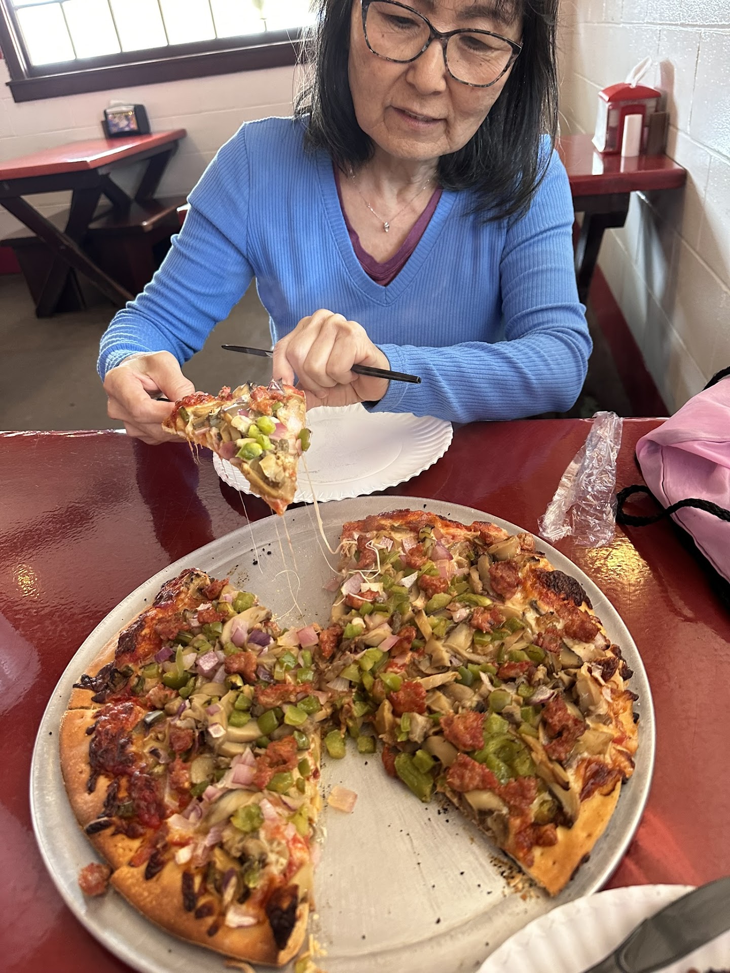 While waiting, we pondered this explanation, and came to an agreement that it probably does weigh "pounds more.". It did take about 45 minutes, and it was so stuffed and heavy it definitely weighs "pounds more." It was very reminiscent of stuffed Chicago Style pizza, and very delicious. Panjo's was recommended to me by a local, and now I too am a fan! If you're contemplating whether to get a Large or a Giant, the large is probably enough, but the Giant is only about $3 more so it seems like the...
