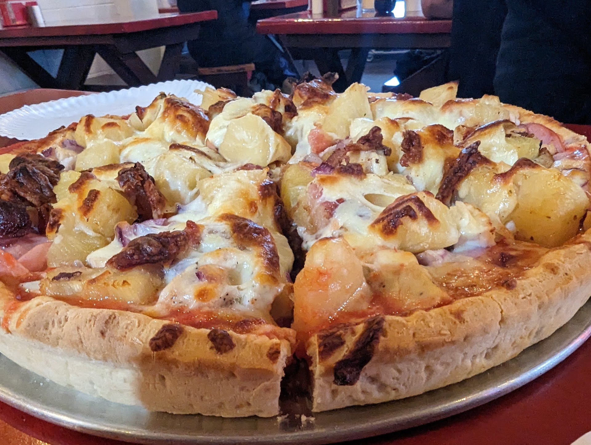 We got the Maui Jo's Hawaiian and OMG they made it great. They started our visit off right with the friendliest staff who really pay attention to the customers. Even though this is counter service, the guy listened to our questions and fully engaged in answering them, not just providing lip service you might get at a chain store. He explained that it takes about 45 minutes to cook, because it has "pounds" more ingredients than the thin crust equivalents.