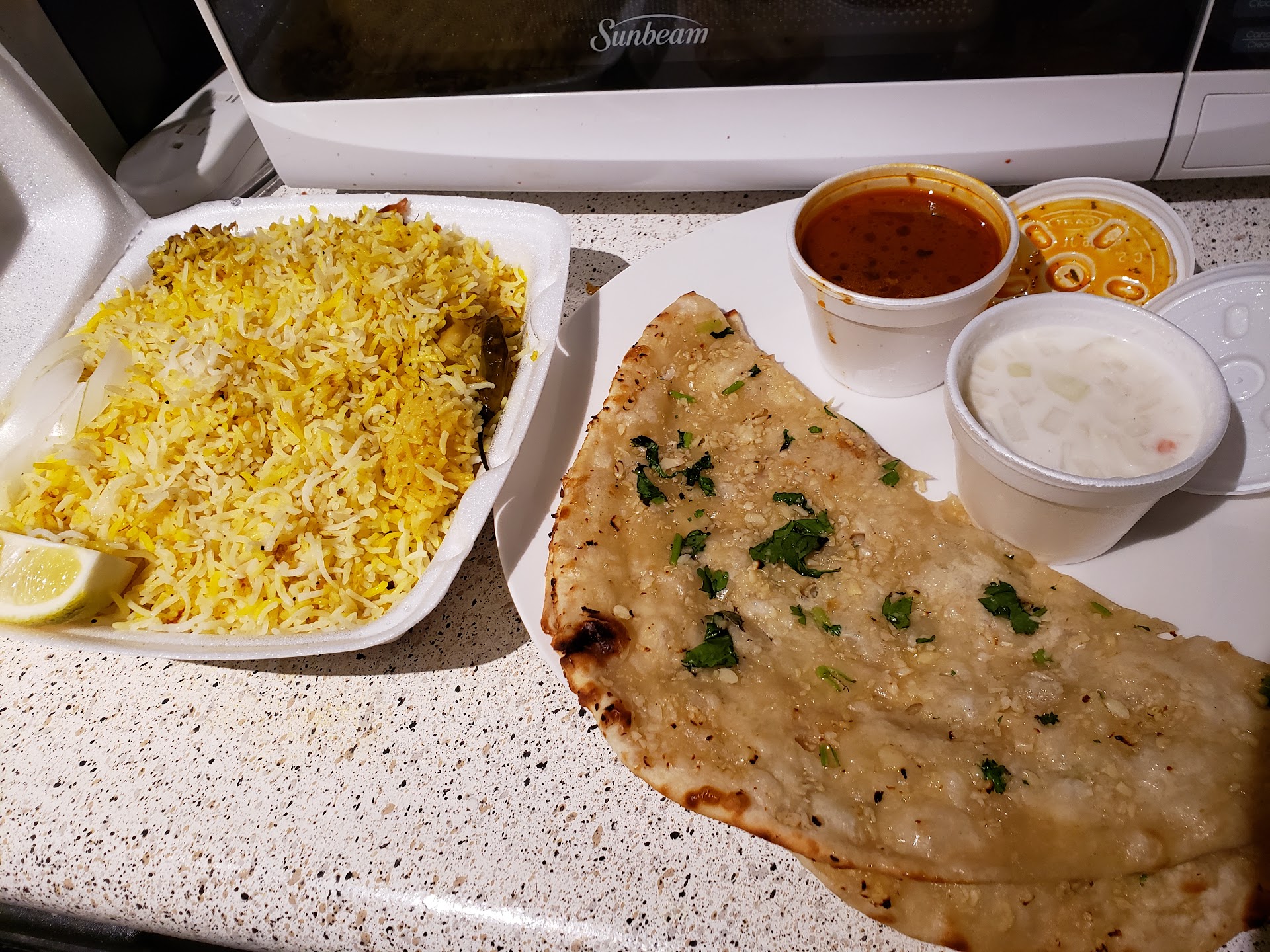 I ordered their chicken biryani with a side order of garlic Naan. The Naan was a little more expensive that I thought it would be, but it was really tasty so I don't regret it. I wasn't quite sure what do do with the two sauces they gave me, so I just poured it on the rice in separate halfs. The sauces were interesting... one was a more savory brownish/red sauce while the other was white, milky, and a bit sweet - sort of like coleslaw.