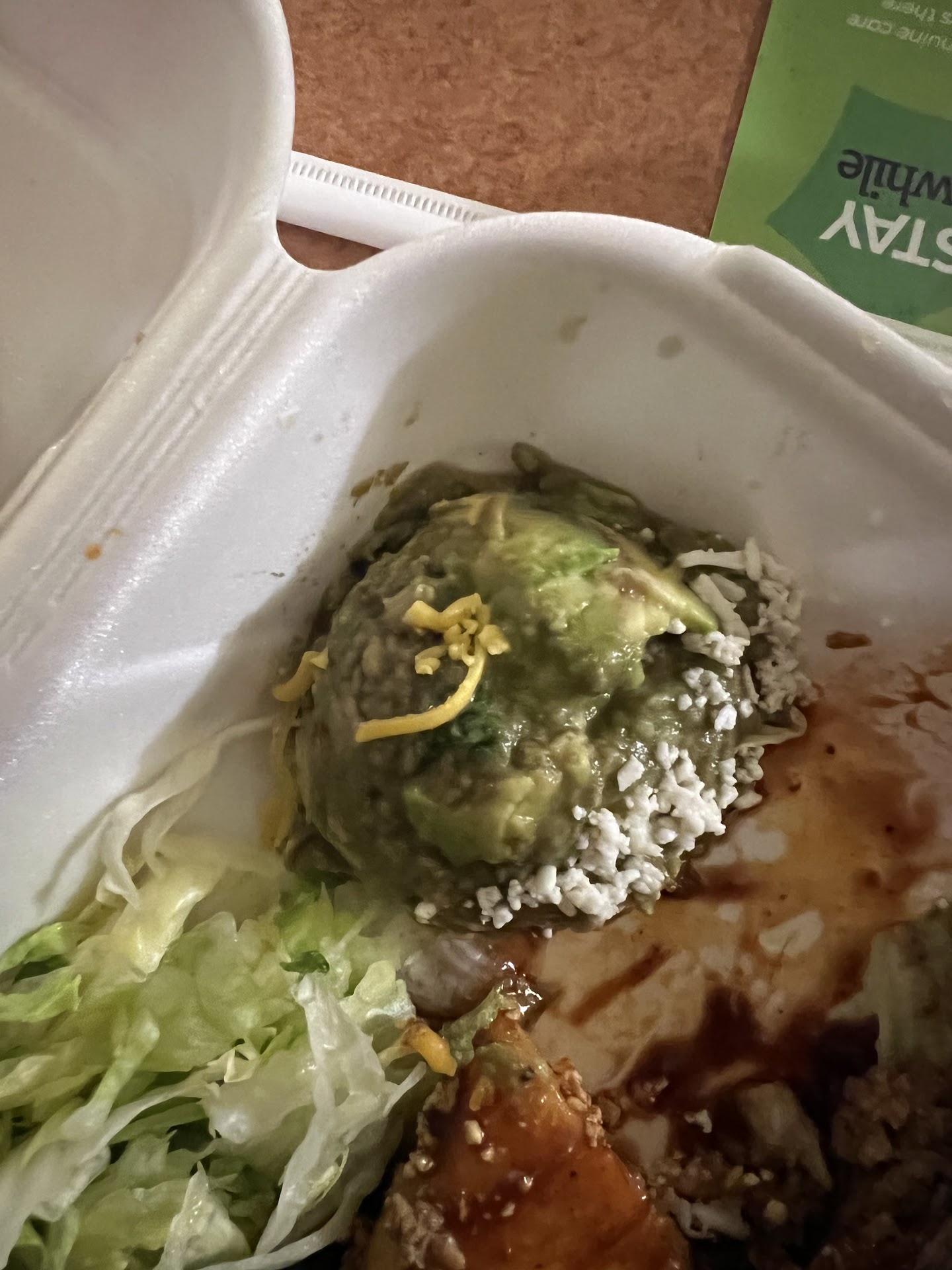 Next, letās talk about the food. The first thing I will say is that the tortillas smell wonderful. That being said though, they are tough and rubbery. It is like trying to bite into a tire. The refried beans are so watery that they ooze out of the taco and make the biggest mess. The cheese is horrible. It is shredded and greasy and I mean cheap quality greasy, not cooked greasy.