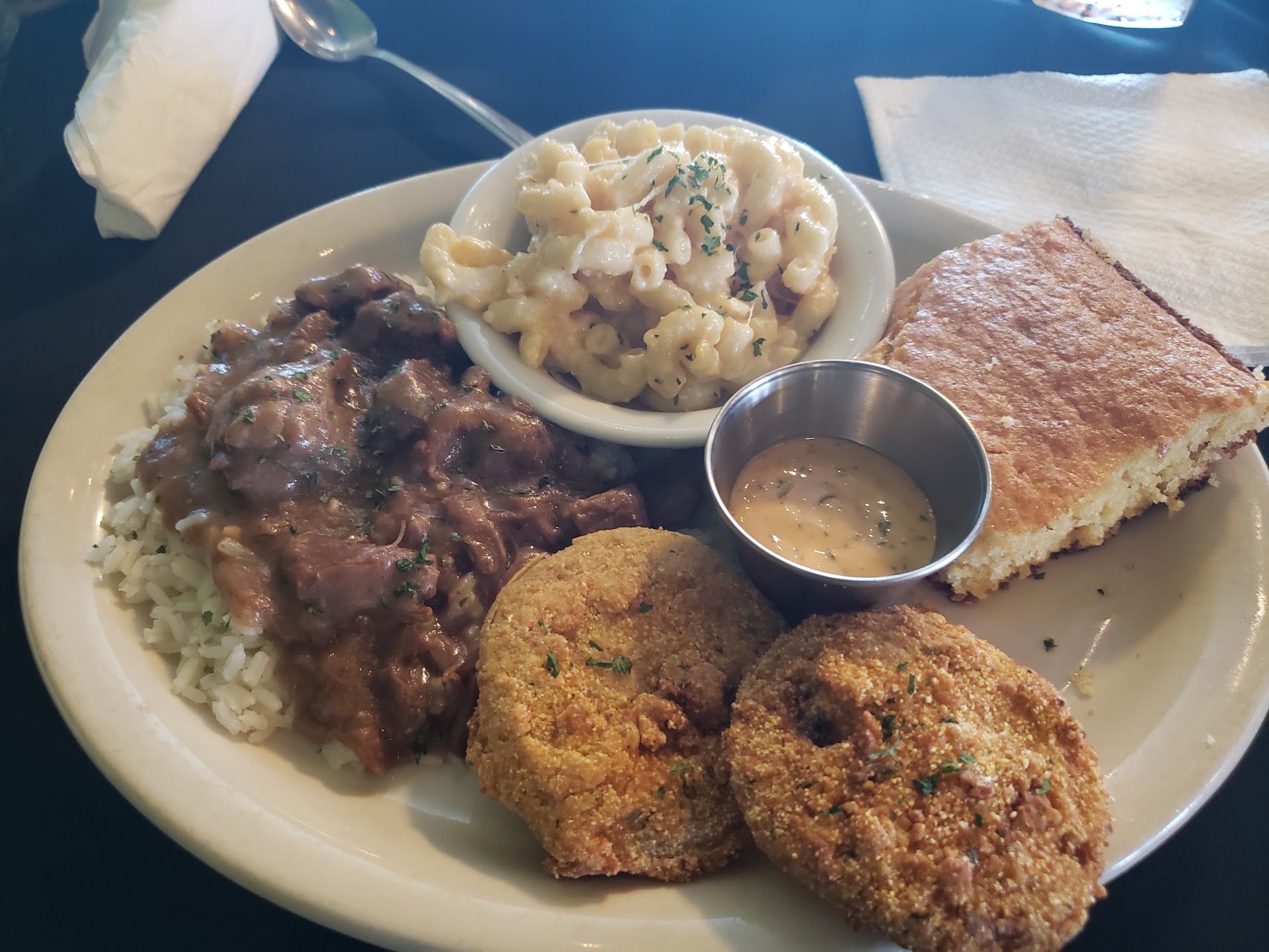 Coming hot off of The Texas Bucket List, the Mrs. and I were excited to try some soul food done right. I was relieved that they relocated to their own restaurant, because the previous one was hidden inside another building. Unfortunately, there are only specific dishes for specific days. We arrived on a Tuesday, so we tried the beef tips, fried chicken, and a porkchop. The accompanied sides were mac and cheese, yams, cabbage, and fried green tomatoes. The fried chicken was fresh and crispy, though it was a bit under seasoned. Not bad, but no better than if you made a batch at home with your mom. The beef tips were tasty, although the portion was on the smaller side and the beef could have been a bit more tender personally. The side porkchop was fine, though needed more salt. The sides were quite disappointing as well. The mac was oddly very sweet. They also lacked that cheesiness you would expect from such a beloved dish. The yams were sweet as well. That is to be more expected, but they were sweeter than what we're used to and were sitting in a syrup base. Honestly, I would suggest putting those yams inside of a pie crust instead and turn it into a dessert. The cornbread was sweet as well, but I welcomed it. The fried green tomatoes were fine, though again, needed a bit more seasoning. Overall service was great, and the atmosphere was nice. In the end, I would take this joint with a grain of salt. Though, there seems to not be much competition in the city...