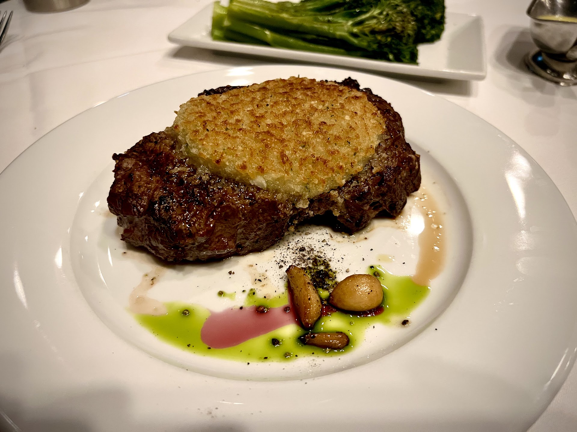 Read moreCanât say enough good things about our experience here, but Iâll try to convey the point. We made reservations and requested a window seating to view the bay, and upon arrival our table by the window with the bay view was ready. The hostess was so friendly and polite. She introduced our waiter and looked over the menu which can be overwhelming as all the options are phenomenal. I would recommend looking over the menu online before sitting down so youâre not flabbergasted trying to decide. We ordered the quail leg appetizer to start. While waiting we were brought some fresh baked in house bread , warm and pillow like interior, crusty, cheese coated and salty crust - this bread was fantastic. Waiter came back with our appetizer- the quail legs are fried and coated in a â sweet heat â sauce - tasted fantastic, skin was crispy, meat was tender and the sauce was a perfect mix of sweet, savory with the slightest kick of heat. For our entrees, my wife ordered the sautĂ©ed jumbo shrimp - large fresh shrimp with fresh fettuccine pasta, a rich buttery Alfredo like sauce, crumbled feta, shallot and capers. They really donât skimp on the shrimp and the shrimp taste and texture was extremely fresh. She loved it. I opted for the cast-iron seared Buffalo ribeye - medium rare - comes topped with a roasted garlic / marrow rosemary crust. Wow, fantastic - steak was cooked to perfection , melt in your mouth texture , meaty and fatty ( it is a ribeye after all ) , and the garlic marrow crust on top put the flavor over the top. Please note that the entrees do not come included with sides and that is an additional charge. For a side we ordered a half share of broccollini - which is essentially baby broccoli with longer stalks and smaller florets. It was seasoned and cooked well and came with some type of sauce which if I recall correctly was a buttery hollandaise and also tasted great. We had to finish with something sweet and went with the crĂšme brĂ»lĂ©e. Beautiful dish with a Texas shaped sugar cookie on top of the dish , homemade whipped topping with berries and the creme really hit the spot. This place is expensive , but the quality and service matched the price. A small duo band playing keyboard and drums added to the atmosphere. If you want to impress your date or colleagues, this place doesnât disappoint. Donât come here expecting to spend less than $100 for two to dine. The view is also fantastic, offering scenic views of the bay and the city. 10/10 , would recommend especially if staying...