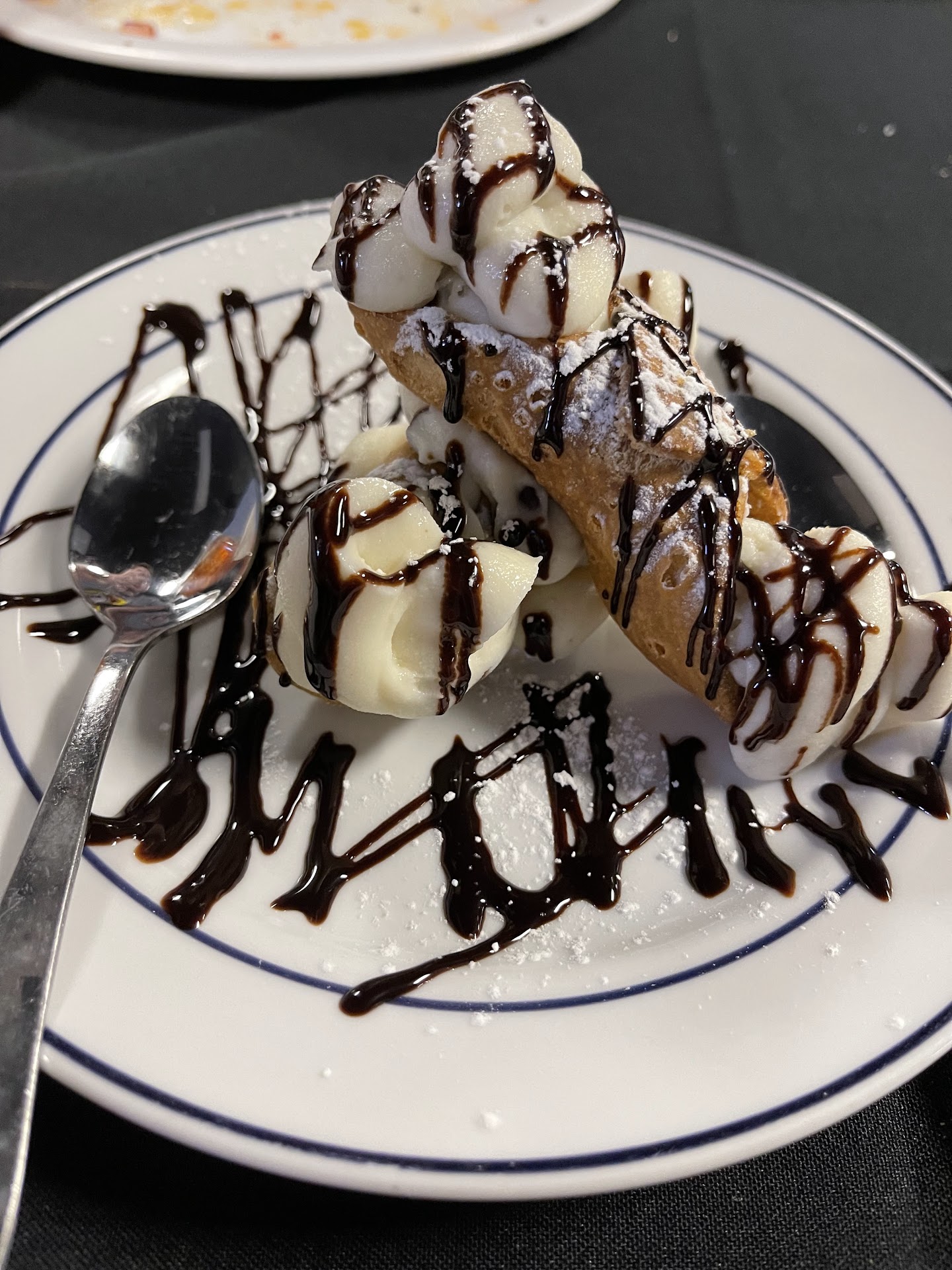 Went there with friends for lunch , it was still early so we were the only ones there. ( I driv e by at night and parking lot is packed) I ordered a Cesar salad ( and should not have) I did order the small ( ha ha) pizza because we did not want leftovers in a hot car , as we had errands to run. I think when people ask , they should say 6 LARGE pieces of pizza 12',did not mean anything to me. I usually order home delivery and always have leftovers ( from a large pizza). I got the 4 cheese specialty pizza and added meatballs and garlic. It was a thin crust pizza . The crust was perfect , crisp on edges, and soft ,but cooked rest of pizza. You could really tell it had more than 1 type of cheese. I thought it was a white pizza , but it did not have very much red sauce , so that was good. The meatballs were crumbled, and that was ok , but I thought they would just be cut up and on pizza , so while they did taste good , it could have been anything, ground beef or sausage. I did pay for the extra toppings, which I knew , but I told the server that when I paid extra and asked for garlic , I wanted garlic and wanted to taste it. He offered to bring me some garlic on the side? In a bowl? I said no , it made no sense to me to add AFTER pizza was cooked. I did get a "surprise " from the server ( it was a celebration) which was nice , but I had expected to PAY for a dessert, and I wanted a different cake , and I was going to take cannoli home , but they did not ask , so I did not say I wanted them. So my advice to the server is WAIT. It was a very nice...