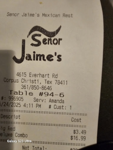 Read moreI had a hankering for fajitas so, I and a friend decided to try Senor Jaime's as it was recommended to us through another mutual friend. We were not impressed. Prices were higher than what the menu said and we were told upon checkout that if we paid cash the cost would be lower. The server/manager said the menu was out of date and the price was different. We weren't told that in the beginning. I ordered a mixed fajita that was supposed to have been 13.99, Ended up being 15.99. The chips and salsa was also 6.00 not provided as they are at every other Mexican restaurant anywhere. The beef was like leather and the chicken was dry. I'll never go back. On a scale of 5 I'd rate the food and service as a 3. On a scale of 10, I'd rate the whole thing as a 5. The only "good" thing that was acceptable was it wasn't 'loud' no banging music or children. Maybe they have better service and food during happy hour or evening hours. We arrived a little after noon. I hate the business wasn't all it was hyped up to be; and I'm sorry to be a poor customer, but I work hard for my extra money and expect to get what I pay for nothing less. 23.00 for two fajitas and a glass of water...