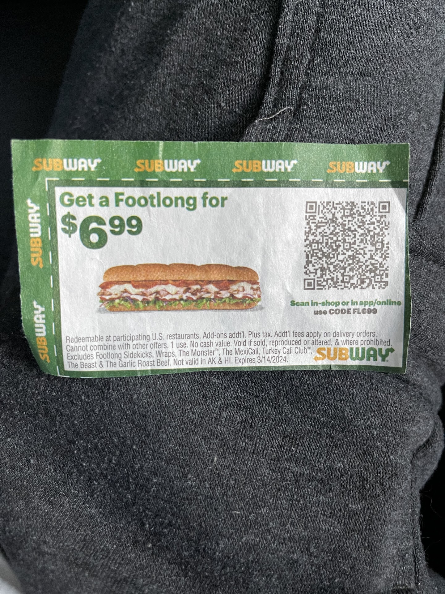 Read moreI’ve been to this subway 10+ times because it’s so convenient since it’s right next to where I stay. This time today I tried going to grab what I usually grab. A foot long spicy Italian. Almost every time I had a coupon to use for a $6.99 foot long. I was never declined until today. The employee told me that the manager does not accept this. I then told her I’ve literally used this type of coupon 5+ times at this location, and no one has ever told me I couldn’t get a spicy Italian with it. It literally says what it excludes on the coupon. This made me hella mad, and I will not be coming back here again. Disappointing. Whoever the manager is needs to get re-evaluated for their position. Cherry on top, they were about to sell me some black spinach that was wet and old on my...