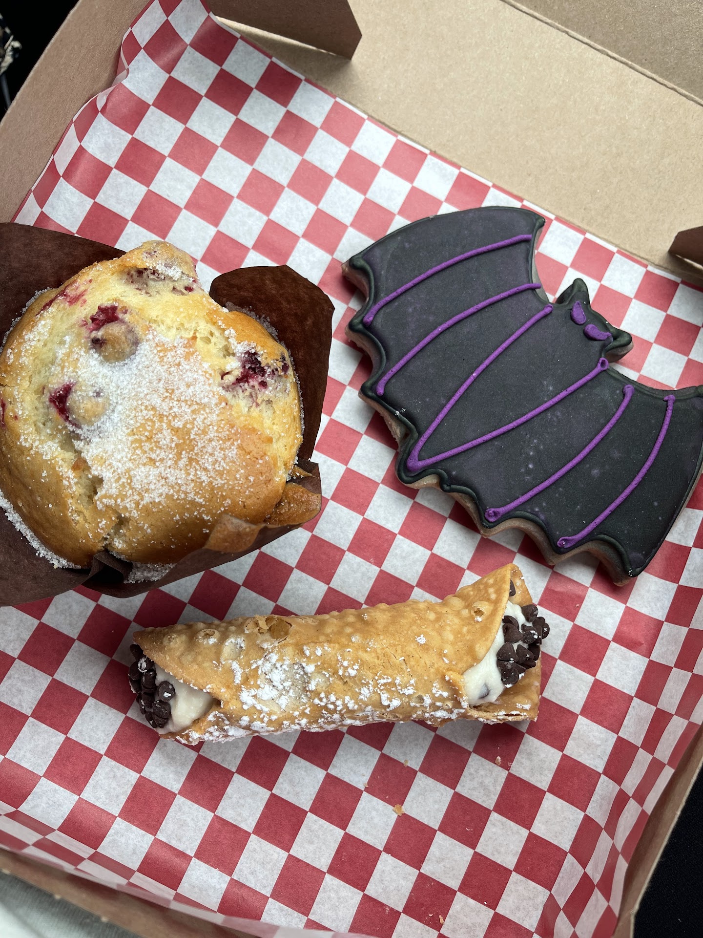 The bat sugar cookie was so cute, the cannoli was amazing! The outside shell was crispy and the creamy filling didnât make it soggy. Lastly, the cranberry muffin! Tart from the cranberries yet sweet from the sugar on top as well as the super moist muffin! So good!!