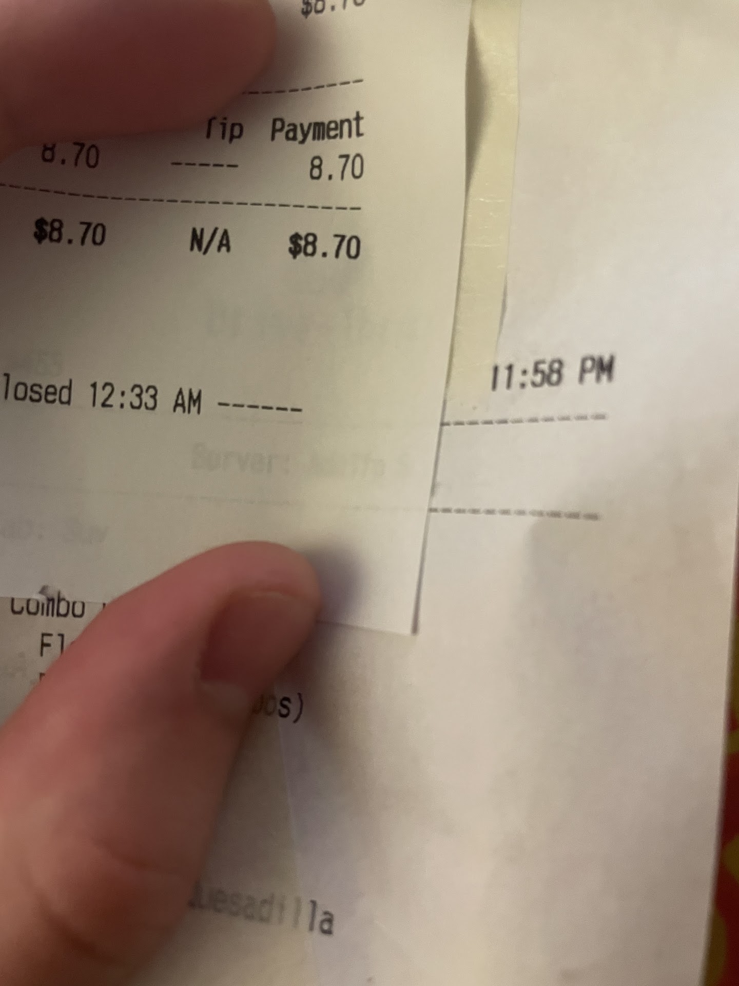 To Management/owner - get your shit together. Stop having your staff ask for good reviews to artificially inflate your Google score, they are not earned they are begged for. Train your staff better, or set expectations out the gate that you have to raise your damn cattle before you slaughter and process the meat, because I have no clue how you make 2 tacos and a quesadilla take 30 minutes. Do something because whatever the hell you’re doing isn’t working. Shit, post this on the fridge at home if you have to have a damn reminder to do your job better.