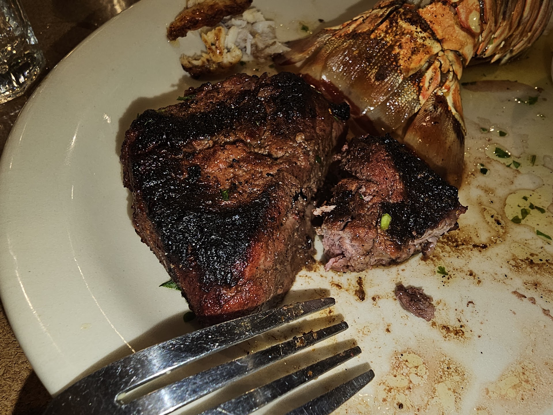 When the food arrived I was on the phone & wasnt really paying attention, she set the food down & walked away. I hung up the phone & saw a rocklobster tail & a burnt filet.