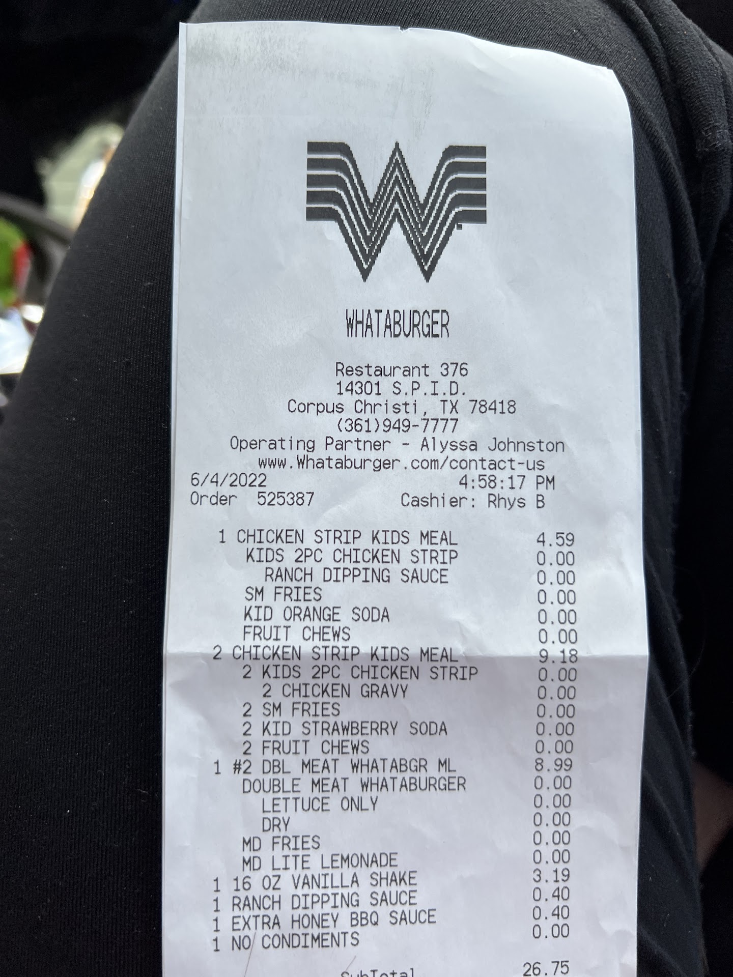 Ā Ā Ā Read moreIāve been eating Whataburger as long as I can remember(Iām 71) and theyāve always been my go to burger! That all changed when they sold outā¦.theyāre not the same anymore more! With that being said, living on The Island, theyāre just too convenient so my wife and I still eat a lot of themā¦..thatās our choice to do so. What I donāt understand is why our WB on The Island has such a hard time getting an order right?? Iād say around 1 in 5 drive through orders are WRONG! Iām writing this after I just picked up an order only to get home and find out an item was missing! Should have checked it before leaving but I was by myself with people waiting in lineā¦I guess Iām just venting because it happens so often but it sure seems like a simple thing to double check an order before sending it out the window! ...