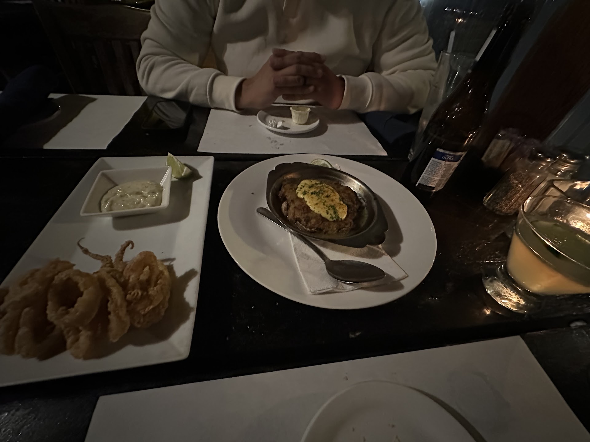 Now to the cons. I have never, EVER left a restaurant in my entire life feeling more ripped off. I was absolutely floored when I got my bill. There are some average type prices for good seafood on the menu. $26 for chicken plate, $30 something for shrimp plate, etc. We were read the specials and, as a normal person would with specials, you assume they’re going to be similar prices or better. So we go ahead and order the tuna plate and the salmon plate. We start with an appetizer calamari (14$) and get the dinkiest kids sized plate of it after about 30 min. It was probably 10-15 small pieces. So consider that almost a buck a bite for something that tastes like anyone else’s. Next we get our soup. It was good but nothing special. Bread was also brought out and was fine but just plain nothing, probably $1 HEB French loaf plus “butter” that’s just yellow oil. Then the salad comes. It’s the smallest little nothing with a couple mixed greens and two cucumbers and a carrot slice. You could get an HEB bagged salad for $3 and make twice as much as they give you. Next comes the meal an hour later. The tuna was so heavily crusted with peppercorn it was almost inedible. You get about 6 green beans and a literal 1/8th cup of mashed potatoes. This plate ended up being FIFTY FIVE DOLLARS (as the “special”!). My wife got her salmon and it was quite delicious but the “black bean and corn salsa” was honestly about 6 kernels of corn and two individual black beans (I wish I was joking). She also got the infants sized green beans and a mashed potato ball that was about what you’ve expect size wise if it had accidentally fallen onto the plate. This was FOURTY TWO DOLLARS. I could not believe it. Two “specials” plus an appetizer for $119 bucks. I was scared to ask for a to go box bc it might have been $25 for it lol. It really sucks how bad they rip you off here bc the atmosphere and people are great but holy moly I have never left a restaurant more ticked off than I did there....