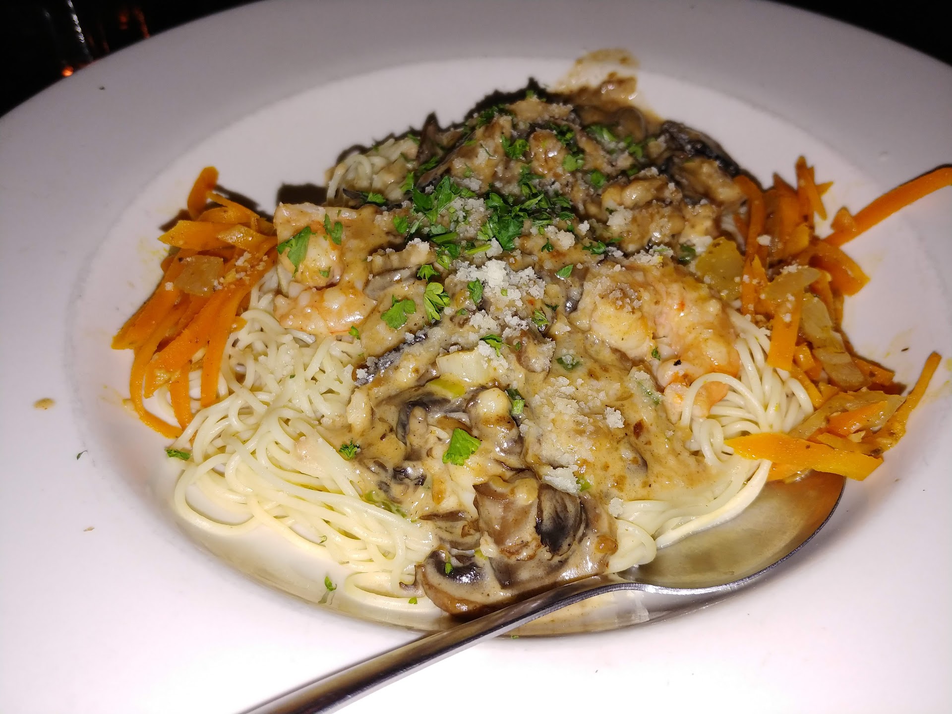 There were 2 complaints: A sharper knife, instead of the cheap serrated one we got, would have preserved the texture of the rare tuna steak, and enhanced the mouth feel and overall experience. The pasta was a little over cooked, so there was a soggy texture to it, which didn't serve the shrimp and sauce well at all. This was the main reason I didn't finish the dish. The flavors worked well, but the texture just got worse as the dish cooled.