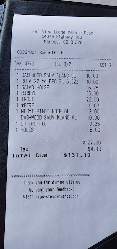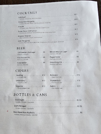 The view is amazing. Unfortunately, that's the only thing this place has going for it. We arrived around 7:15PM hoping to enjoy drinks, snacks, and the sunset. We walked in as a party of 6 and received a whole lot of attitude because they are not really equipped to handle a party larger than 4. (All of the tables are either 2 tops or 4 tops and they do not allow you to put tables together) They have 2 seating areas outside with fire tables that accomodate up to 8 comfortably. There is no propane in the table, though, so don't expect them to be lit. And it's a fire table so if you are looking to eat dinner your plate sits on the edge of the table and you sit on the edge of the comfy seating. (There was a family at one of these and a woman at the other. The server asked the woman to move so we could all 6 sit together) We were asked 2 or 3 times if someone had helped us before anyone actually took our order. (The poor family at the other fire table was forgotten and finally ordered 10-15 minutes after us even though they were there well before us.) When ordering, one person ordered a margarita and was told they were out of lime so they couldn't make a margarita. They asked for a Fenceline (local Mancos) cider. Was told "if we have it." They were out of both cider choices. One person asked for a cider margarita and was told the server refused to make those because they aren't very good. After finally getting the drink order settled it was time for food. 2 desserts and 2 orders lemon pepper chicken wings. Desserts came no problem. An hour later we were still waiting on chicken wings. When asked we were told that chicken wings orders were not showing up in the kitchen. But our desserts did? (Our server stated the kitchen was struggling to keep up because they had 28 rooms booked last weekend and 128 this weekend.) We canceled the wings and magically 5 minutes later they showed up at our table. The menu says they serve lemon pepper chicken wings. There is nothing about buffalo sauce. When the wings showed up and I questioned them their pretend chef came over and told me they start with lemon pepper then toss in the buffalo sauce. WHAT?!?!?! Where on your menu does it mention buffalo sauce?!?!? I would have never ordered buffalo wings covered in sauce. (In my world, sauce belongs on the side so I can control the amount. I do not order meat in sauce.) We received attitude from the moment we walked in and every time we asked a question. I think the server hates their job and takes it out on the customers. The only friendly/helpful people was the food runner and the guy who brought us water. (Speaking of water, it appears they are trying to be a higher end lounge but they serve your water in paper cups) Overall, the entire place seemed to be failing and no one cared. It felt like the customers were an inconvenience because they had better things to be doing. Not sure what though because not a single outdoor table was bussed and the fire table was filthy. My recommendation: bring your own food and drinks to the park and stay in Cortez or Mancos. Which is a shame because Mesa Verde is an amazing park and the entire experience could be a gazillion...
