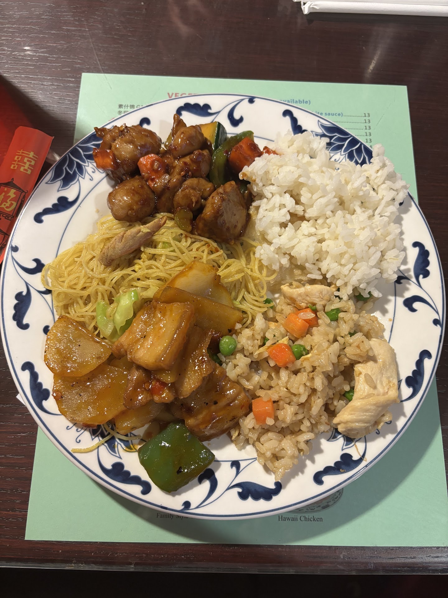 Our food arrives and the bbq pork fried rice and chicken chow mein was lukewarm. The beef+broccoli was hot, but bland.