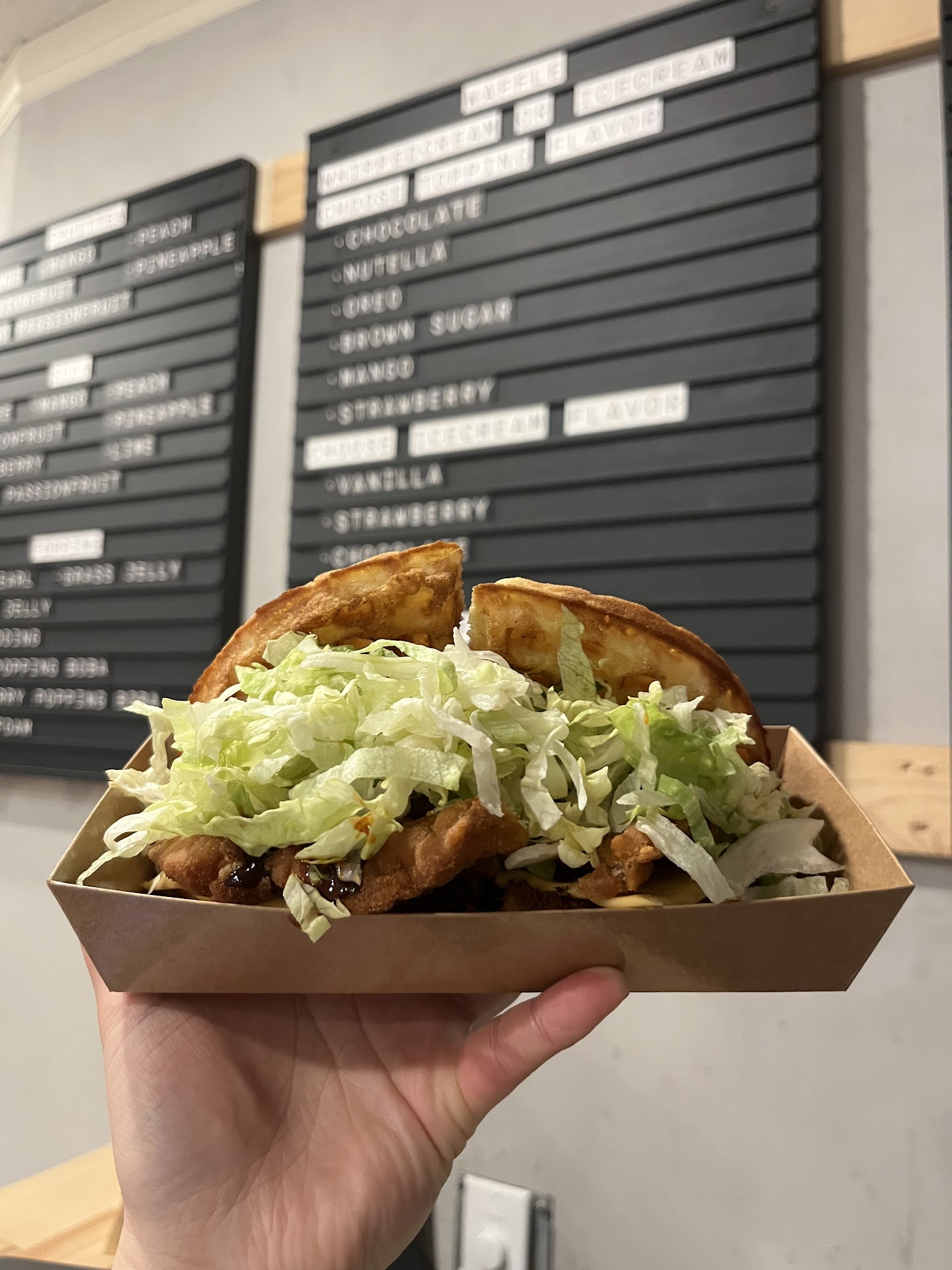 Read moreGot a milk tea and chicken waffles. The chicken waffles was not what I was expecting at all. I got the honey garlic chicken waffle and it was a waffle sandwich. It had the waffle with the chicken inside. The chicken had a slice of yellow American cheese and shredded lettuce. It was alright. I would've liked it better without the cheese. I wish I knew it had it. The menu was not very descriptive. The cups are very cute and have a black...