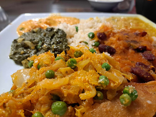 From the buffet vegetarian options, I enjoyed the wonderful harmony of flavor profiles, from spicy to savory and sweet, including counter-clockwise from front center - cabbage and peas, spicy red curry with kidney beans that had a little heat but not too hot, savory and delicious yellow dahl, pulao basmati rice with cumin and green peas, vegetable korma that was a delightful balance of comforting creamy and very lightly sweet, saag with peas - creamed spinach/kale. So good!