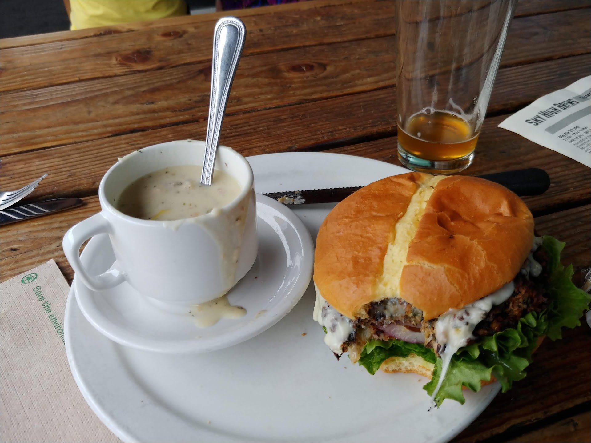 This was my best choice based upon my online research for an Albany/Corvallis area dinner from my San Francisco home looking at maps, pictures and reviews prior to mine. Every place, including this one, appeared to have room for improvement. WARNING: MY UBER ROUND TRIP FROM MY ALBANY HOTEL COST $67 - EXCLUDING THE TIPS. Well... I was playing offense in maximizing out the fun I can have on my road trip to Seattle (Drinking and Driving is stupid). The experience matched my research very well with what to expect; I doubt one of the runner-ups in either town would have been as fun of a dinner experience as Sky High. When my Uber arrived here, I walked around this gorgeous town a little bit. When I opened the door to this place, I was lit up with excitement going up the bare wooden staircase with wooden walls and big chandeliers - what welcoming architecture! Looking out the window to see this crowded rooftop patio, I just wanted to sit there so bad; AND... I got a table after only a 5 minute wait. Going crazy with my selfie stick during the wait made the hostess and other waiting-to-be-seated customers laugh. Other diners and the waitstaff were also laughing at my selfie activity; the guy at the table next to mine had some smily fun bombing my selfies - contributing to the fun. Dinnerwise, I had the Veggie Burger with Clam Chowder, the Freewheel IPA and the Dream-on Pale Ale. I also had the Panorama Porter brownies for dessert. The burger was not sloppy (the way I like it) and the beers were tastily refreshing and not too strong. The brownies with ice cream had a UNIQUE kind of fudginess that i liked and signifies the dinner as something I don't normally have at home. My waitress Callie was a funny partytime waitress, and another from Minnesota struck up a brief conversation (during a lull) with me as if somehow she already knew I had a great time on a prior trip to Minnesota (which I actually did previously have a trip to Minnesota that was a blast). In the Uber case, I learned a lesson about looking at the distance (13 miles, not just across the river), but I'm glad I learned that lesson the most fun and enjoyable way it can be learned - AND I did NOT Drink and Drive. Ok, I will post only the bombed selfie (didn't need my A's hat), but I will post all of my...
