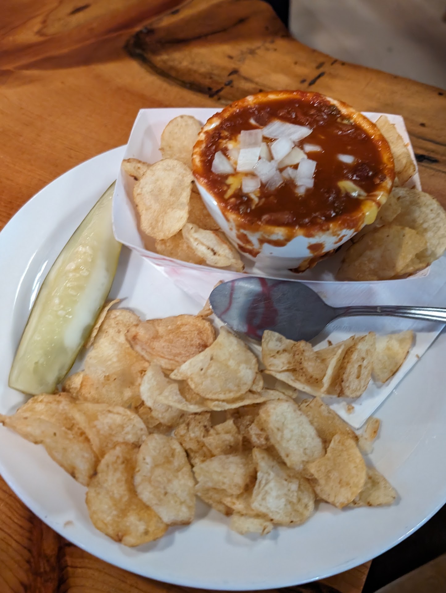 The kitchen staff, Hawkins and Drew made an exception for me and are whipping up some Chili. It arrived in a fry boat, with a Cascade đ„ that I devoured! It was accompanied by many chips that looked kettle cooked. I fed my friend, they are happy, and I enjoyed the briney and salty snap of the pickle very much.